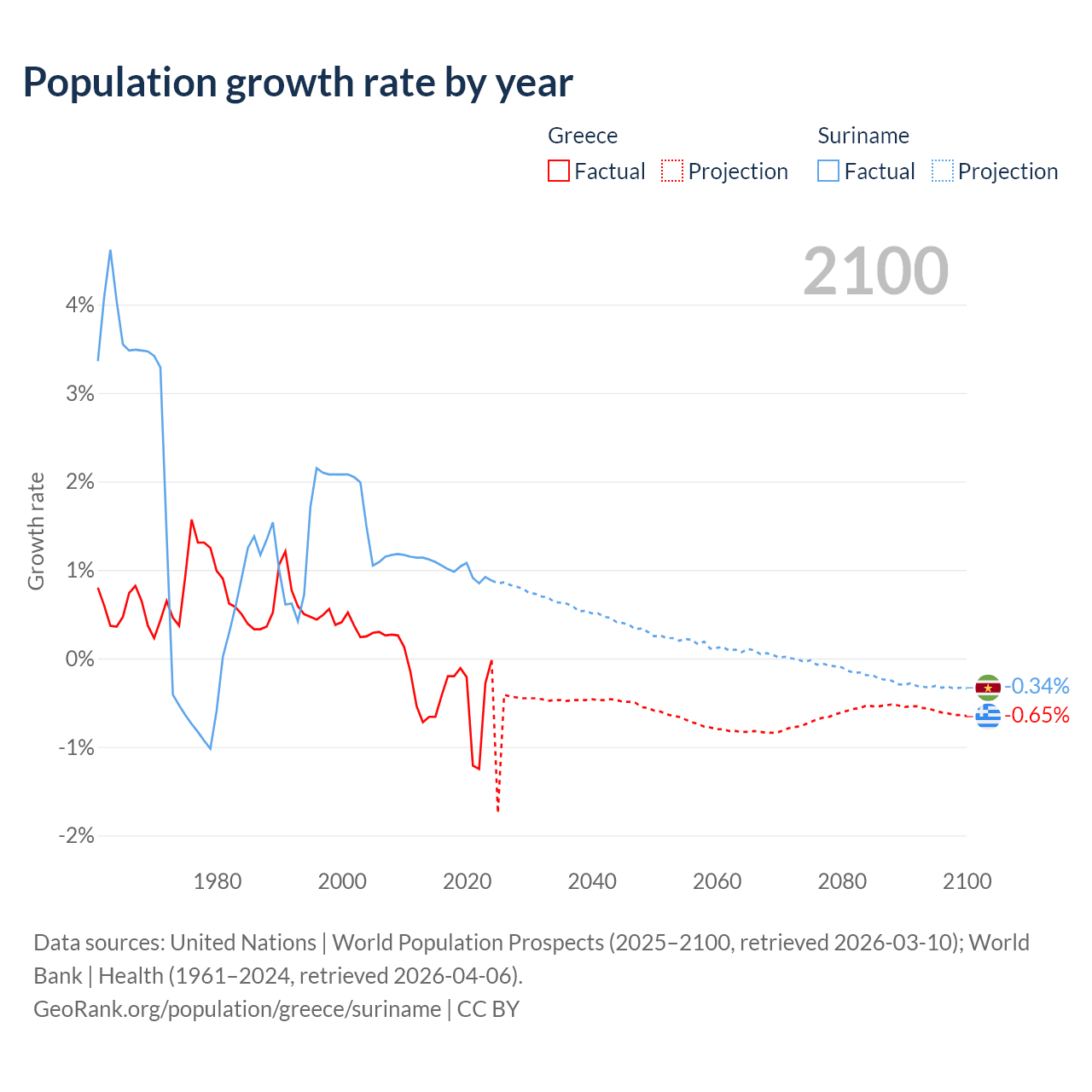 - For the last 10 years, Greece has had an average growth rate of -0.47% per year vs +0.99% in Suriname.
