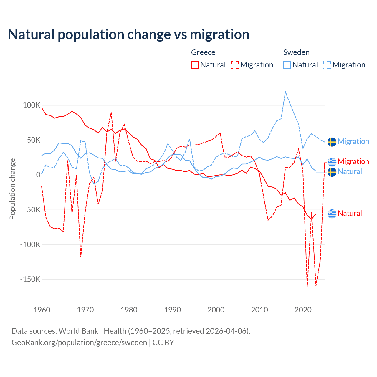 Over the last 10 years, 51.9% of the population change in Greece is from natural causes (a loss of 411,426 people) and 48.1% is from migration (a loss of 381,824 people). In Sweden 21.4% is from natural causes (a gain of 201,900 people) and 78.6% is from migration (a gain of 743,642 people).