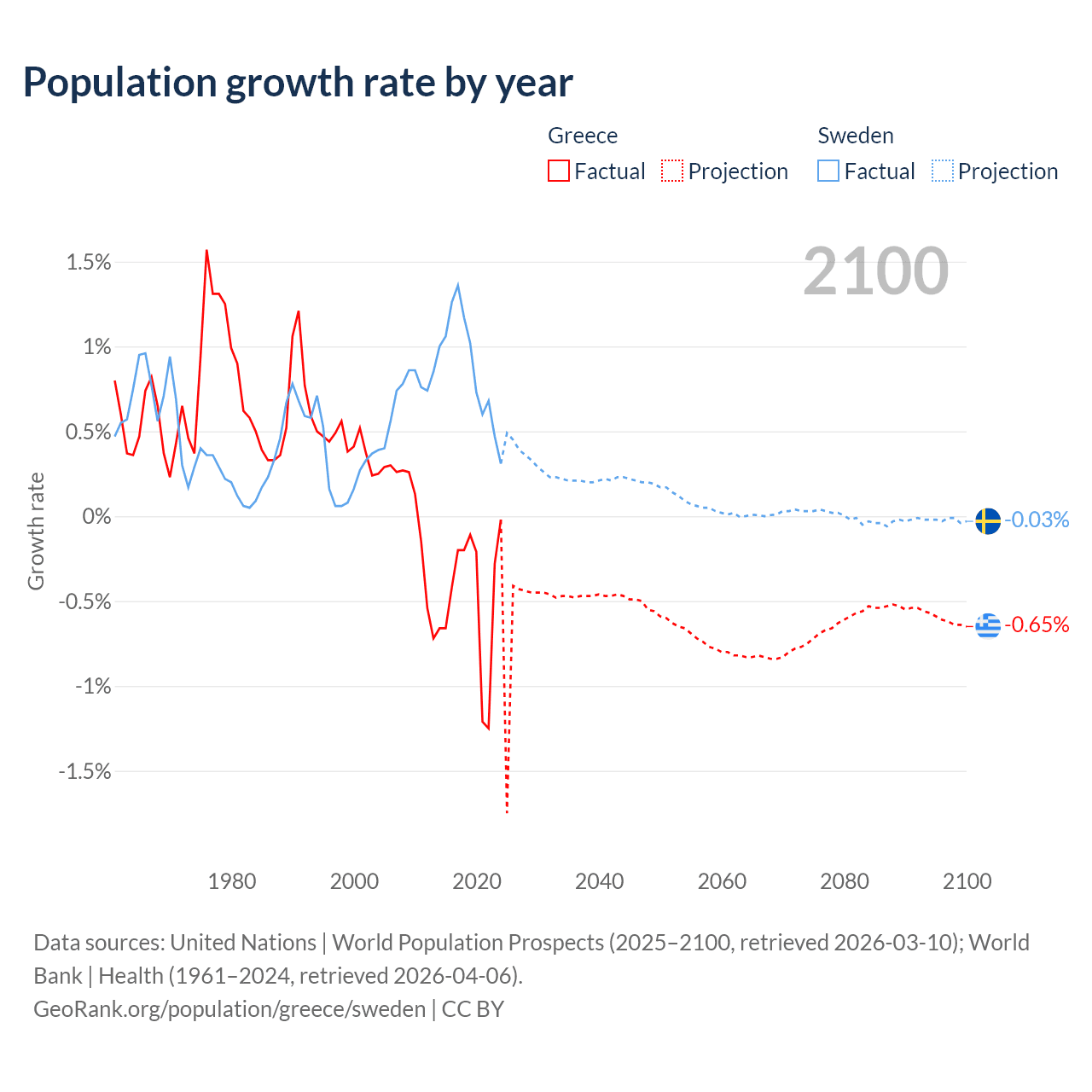 - For the last 10 years, Greece has had an average growth rate of -0.47% per year vs +0.88% in Sweden.