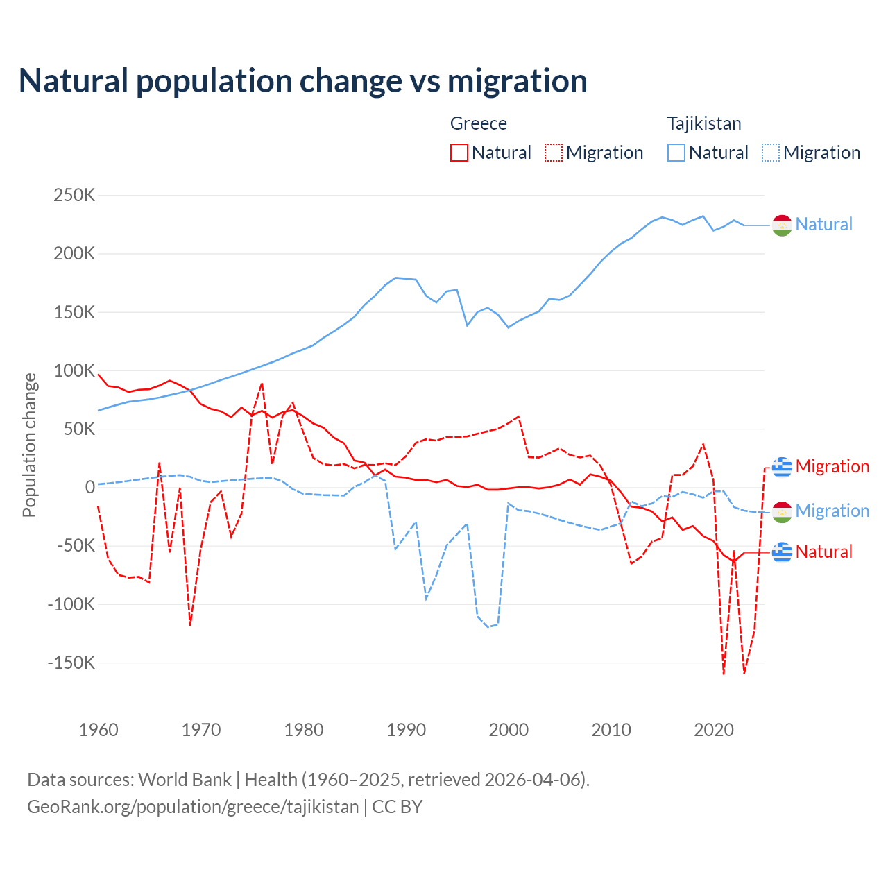 Over the last 10 years, 51.9% of the population change in Greece is from natural causes (a loss of 411,426 people) and 48.1% is from migration (a loss of 381,824 people). In Tajikistan 96% is from natural causes (a gain of 2,266,045 people) and 3.95% is from migration (a loss of 93,205 people).