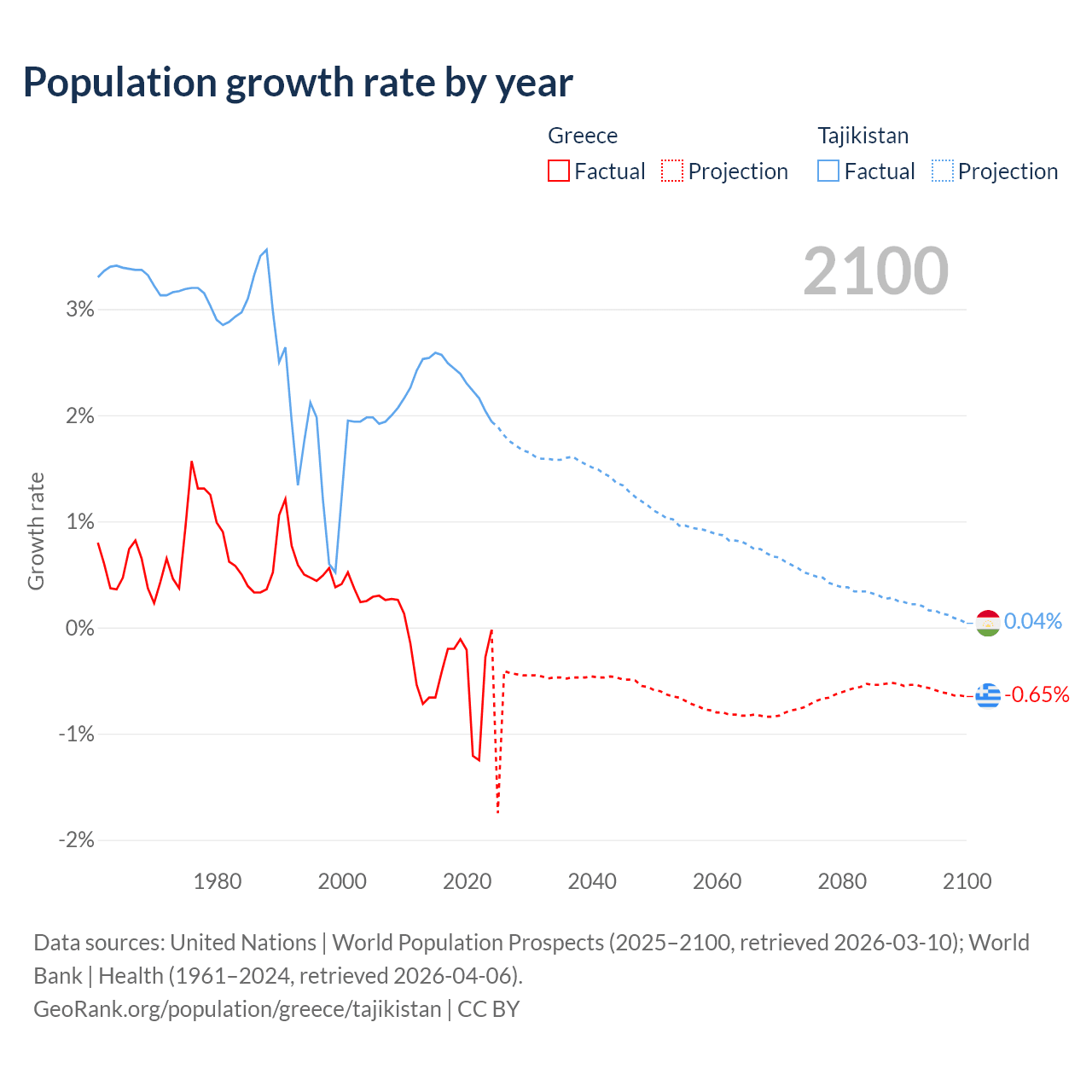 - For the last 10 years, Greece has had an average growth rate of -0.47% per year vs +2.33% in Tajikistan.