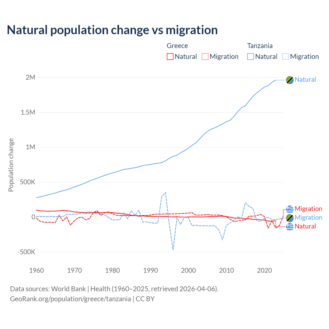 Over the last 10 years, 51.9% of the population change in Greece is from natural causes (a loss of 411,426 people) and 48.1% is from migration (a loss of 381,824 people). In Tanzania 98.7% is from natural causes (a gain of 17,769,541 people) and 1.27% is from migration (a gain of 229,466 people).