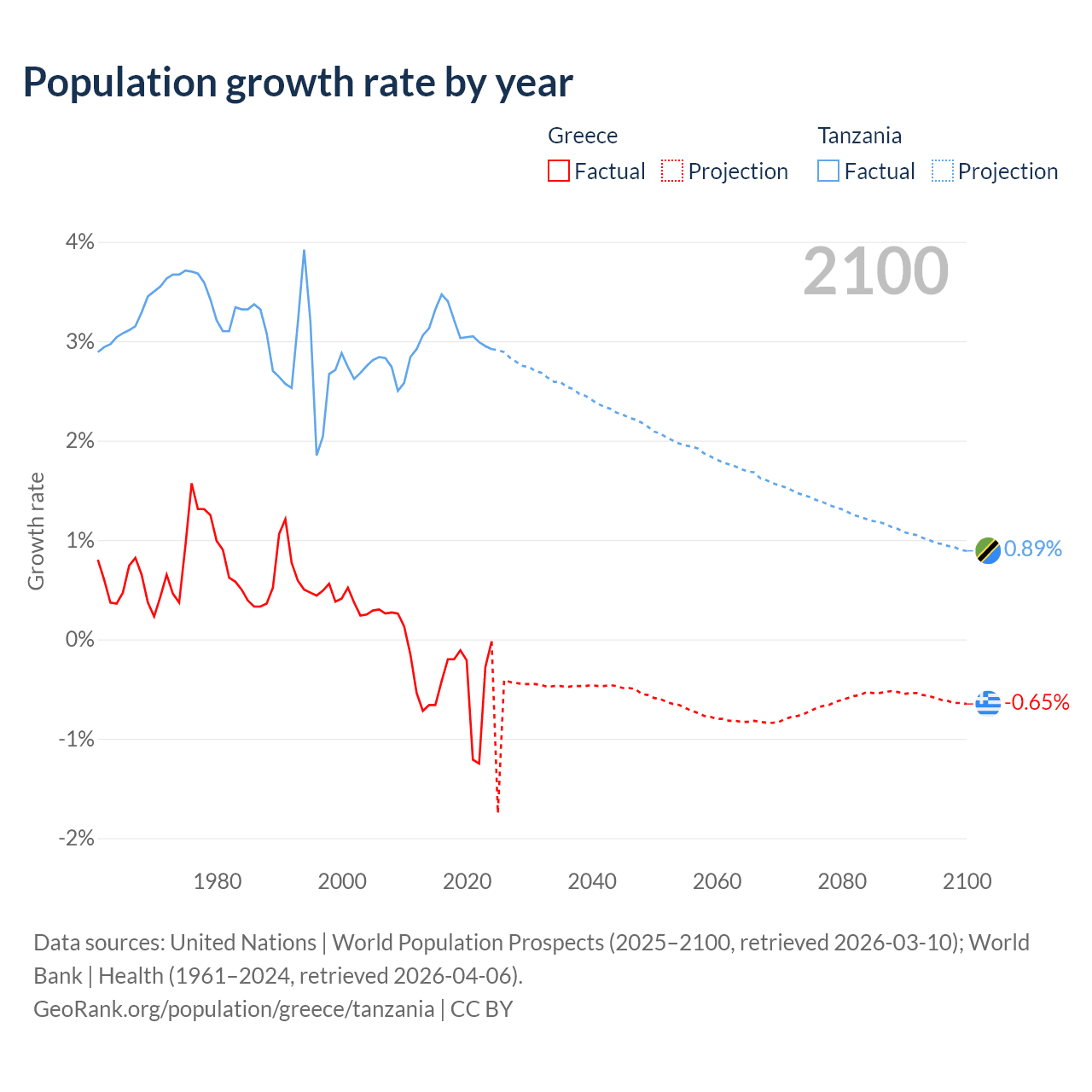 - For the last 10 years, Greece has had an average growth rate of -0.47% per year vs +3.13% in Tanzania.