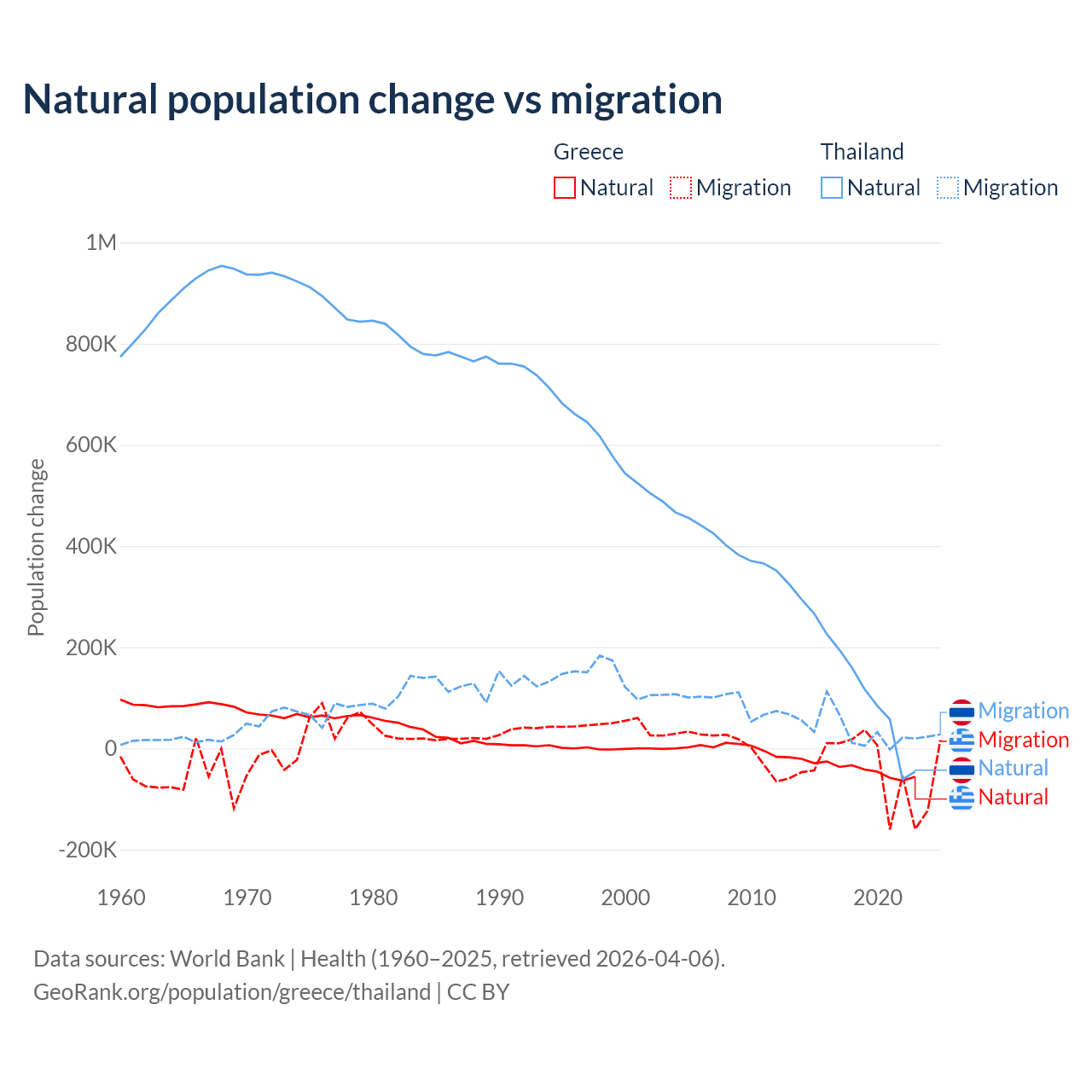 Over the last 10 years, 51.9% of the population change in Greece is from natural causes (a loss of 411,426 people) and 48.1% is from migration (a loss of 381,824 people). In Thailand 78.4% is from natural causes (a gain of 1,292,528 people) and 21.6% is from migration (a gain of 355,361 people).
