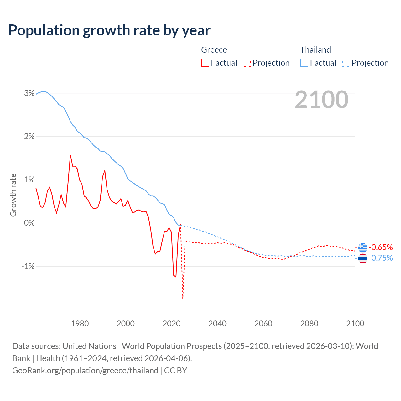 - For the last 10 years, Greece has had an average growth rate of -0.47% per year vs +0.23% in Thailand.