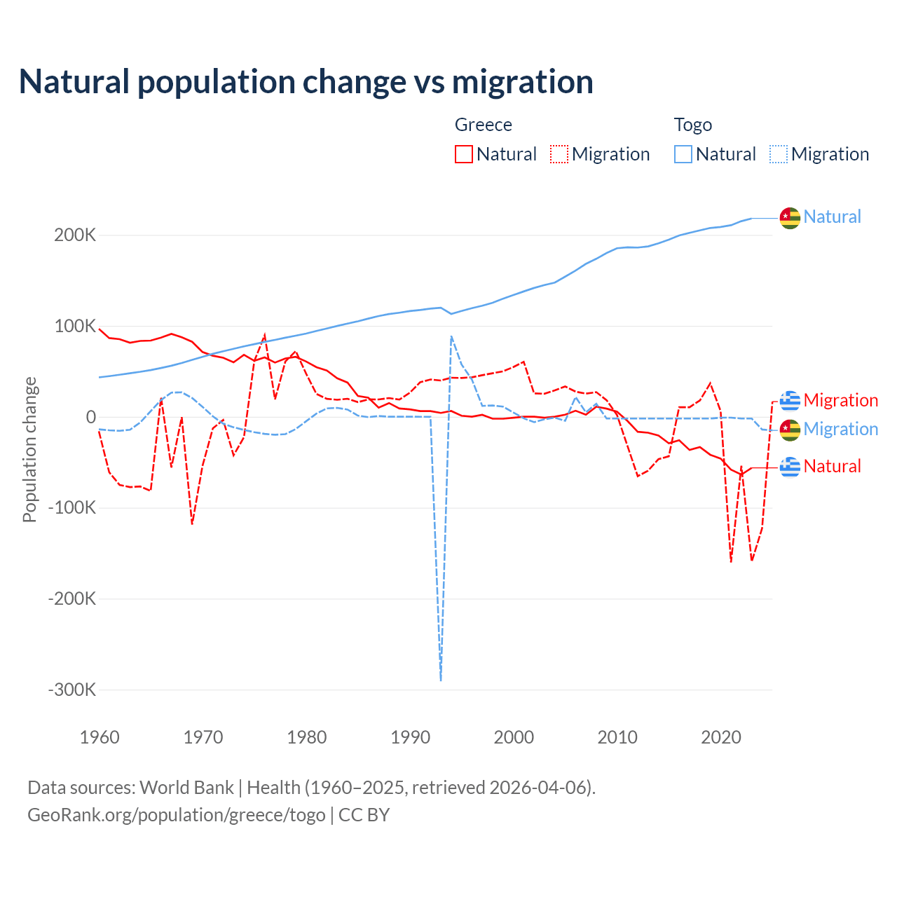 Over the last 10 years, 51.9% of the population change in Greece is from natural causes (a loss of 411,426 people) and 48.1% is from migration (a loss of 381,824 people). In Togo 99.1% is from natural causes (a gain of 2,052,115 people) and 0.86% is from migration (a loss of 17,852 people).