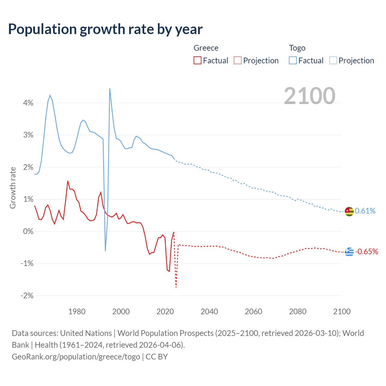 - For the last 10 years, Greece has had an average growth rate of -0.47% per year vs +2.46% in Togo.
