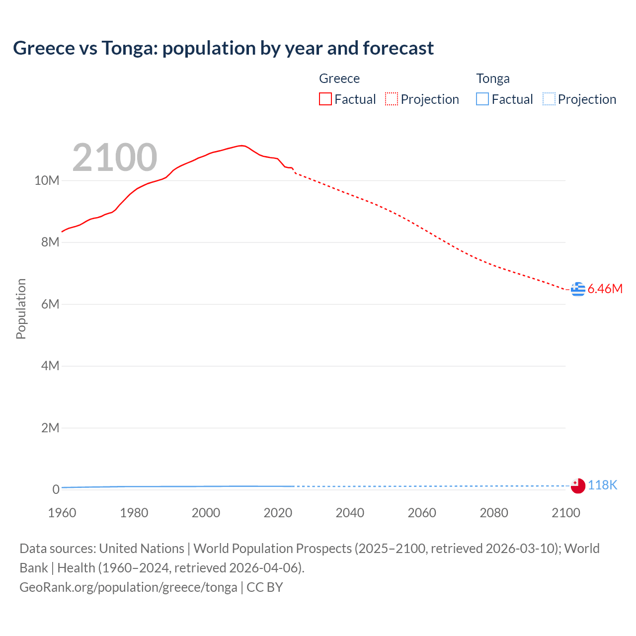 The latest officially reported population of Greece was 10,405,134 in 2024 vs 104,175 people in Tonga in 2024. In 2026, based on the adjusted UN estimation, the current Greece's population is 10,181,414 people compared to 103,309 in Tonga.
