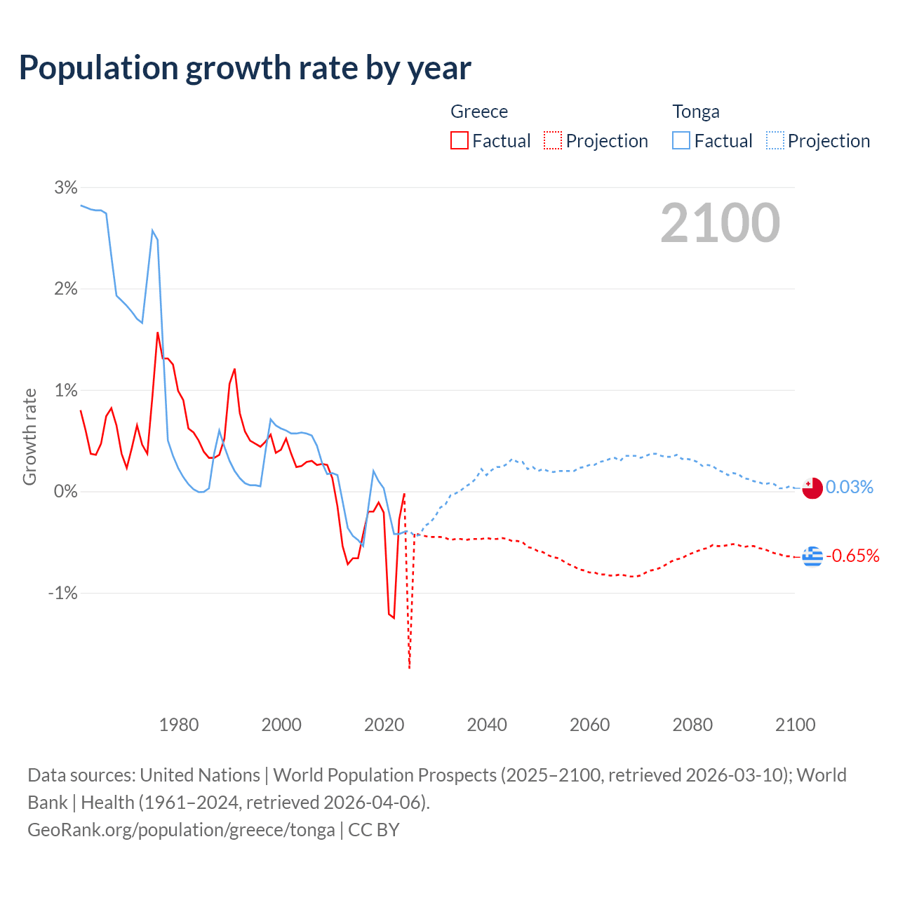 - For the last 10 years, Greece has had an average growth rate of -0.47% per year vs -0.25% in Tonga.