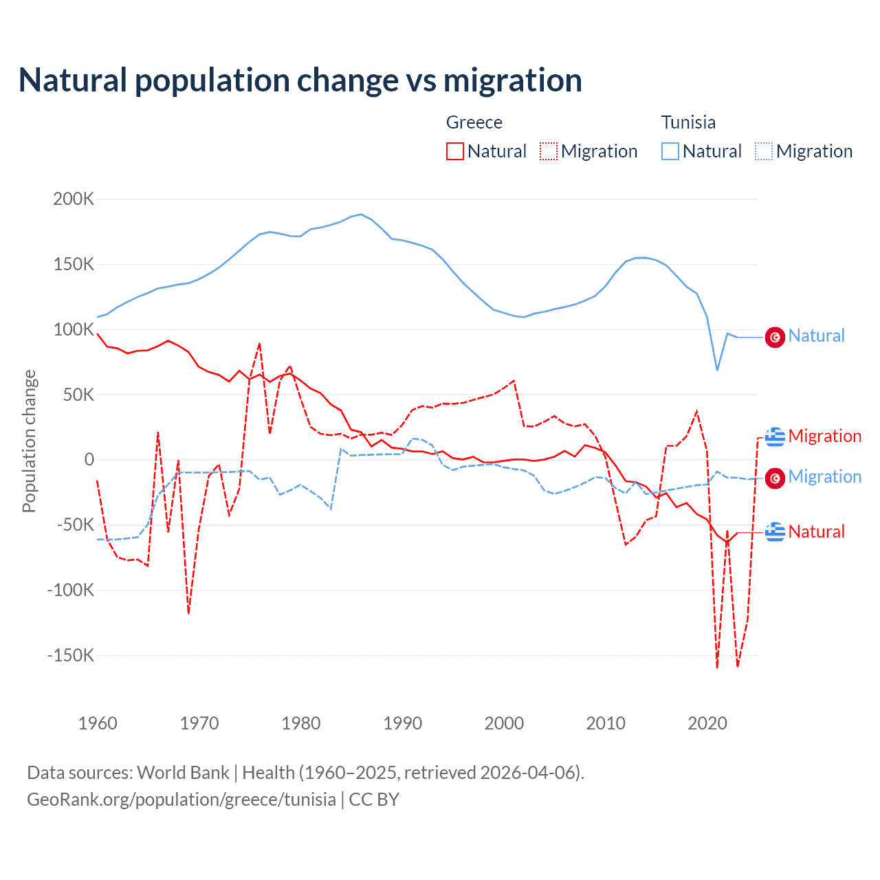 Over the last 10 years, 51.9% of the population change in Greece is from natural causes (a loss of 411,426 people) and 48.1% is from migration (a loss of 381,824 people). In Tunisia 86.3% is from natural causes (a gain of 1,225,079 people) and 13.7% is from migration (a loss of 195,011 people).