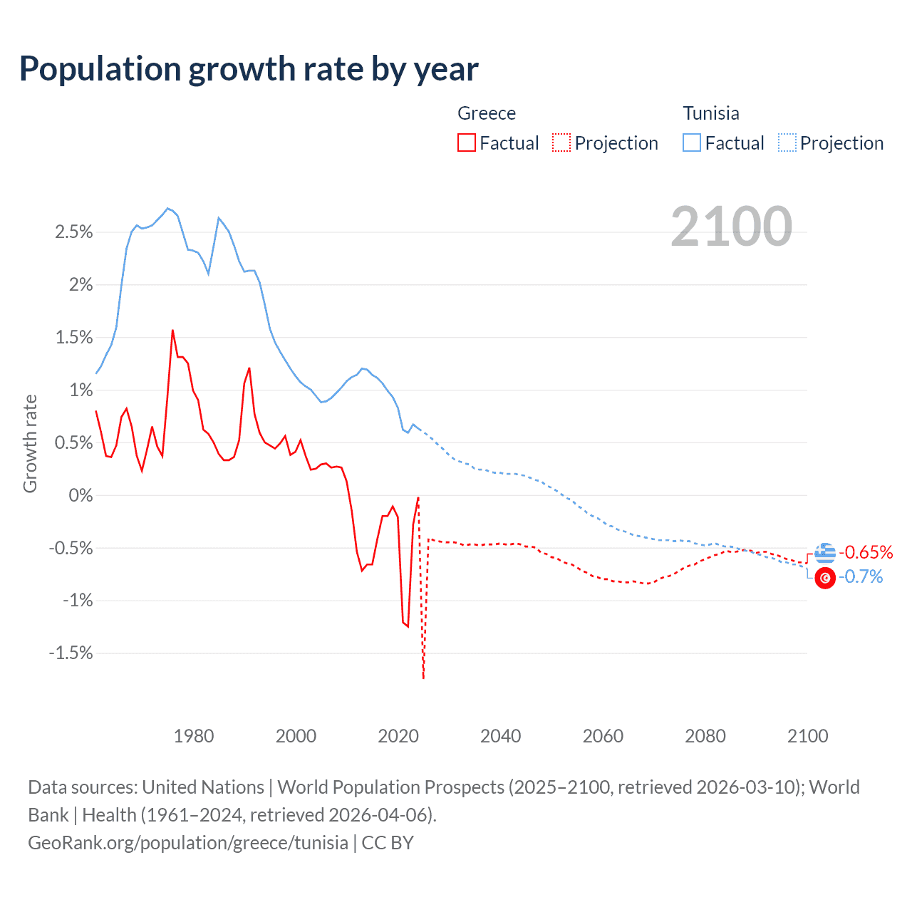 - For the last 10 years, Greece has had an average growth rate of -0.47% per year vs +0.89% in Tunisia.