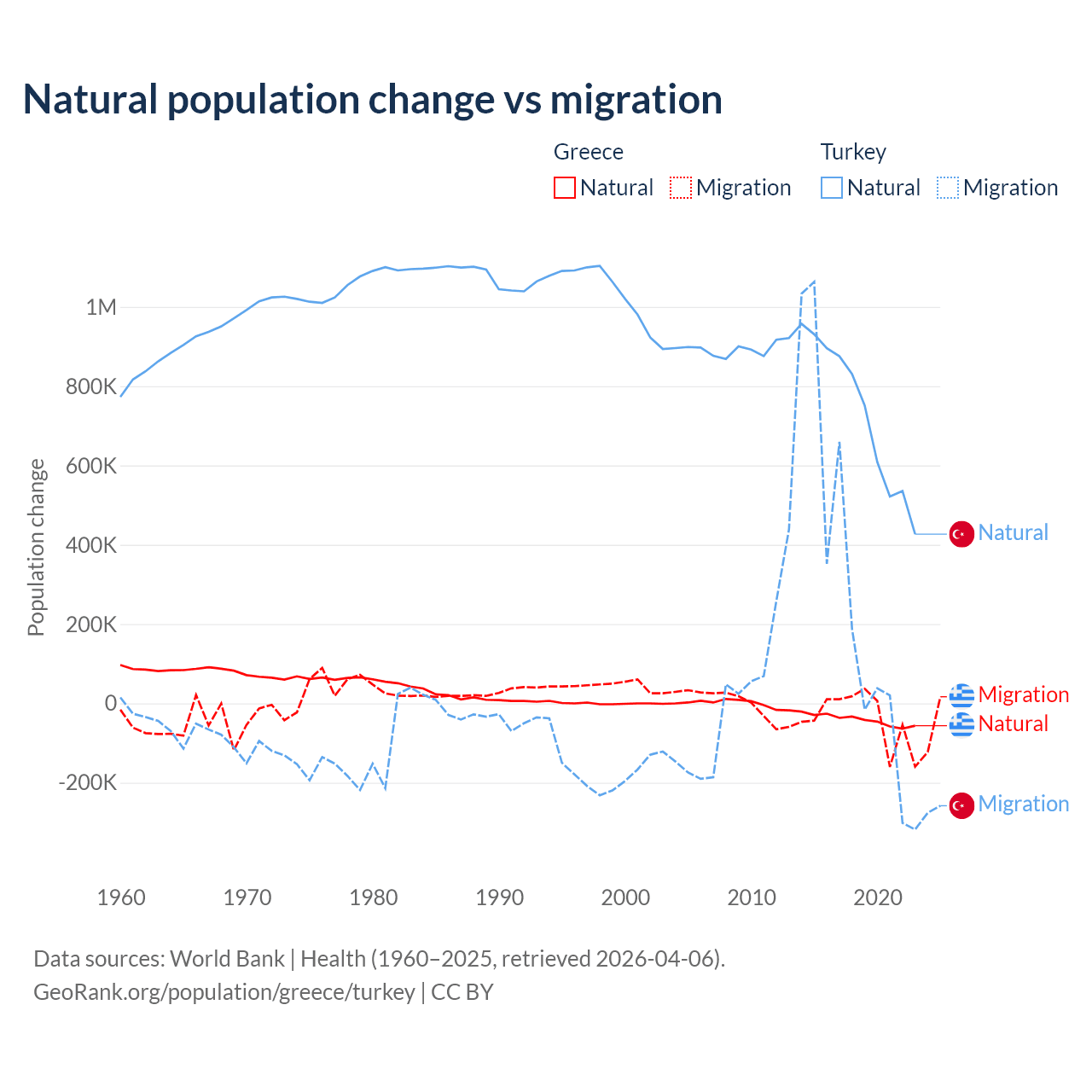 Over the last 10 years, 51.9% of the population change in Greece is from natural causes (a loss of 411,426 people) and 48.1% is from migration (a loss of 381,824 people). In Turkey 73% is from natural causes (a gain of 7,333,352 people) and 27% is from migration (a gain of 2,718,916 people).