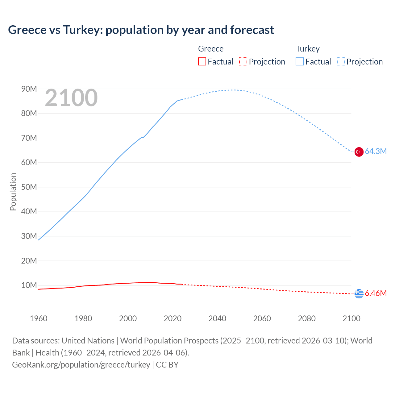 The latest officially reported population of Greece was 10,405,134 in 2024 vs 85,518,661 people in Turkey in 2024. In 2026, based on the adjusted UN estimation, the current Greece's population is 10,181,414 people compared to 86,002,379 in Turkey.