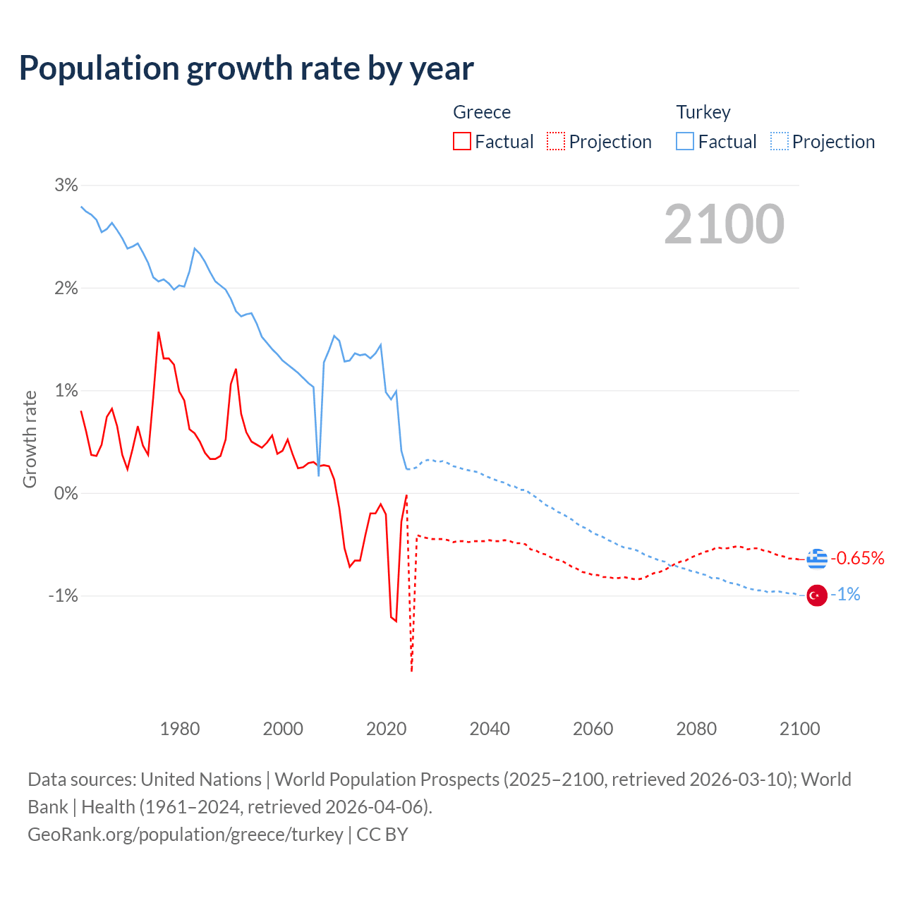 - For the last 10 years, Greece has had an average growth rate of -0.47% per year vs +1.06% in Turkey.