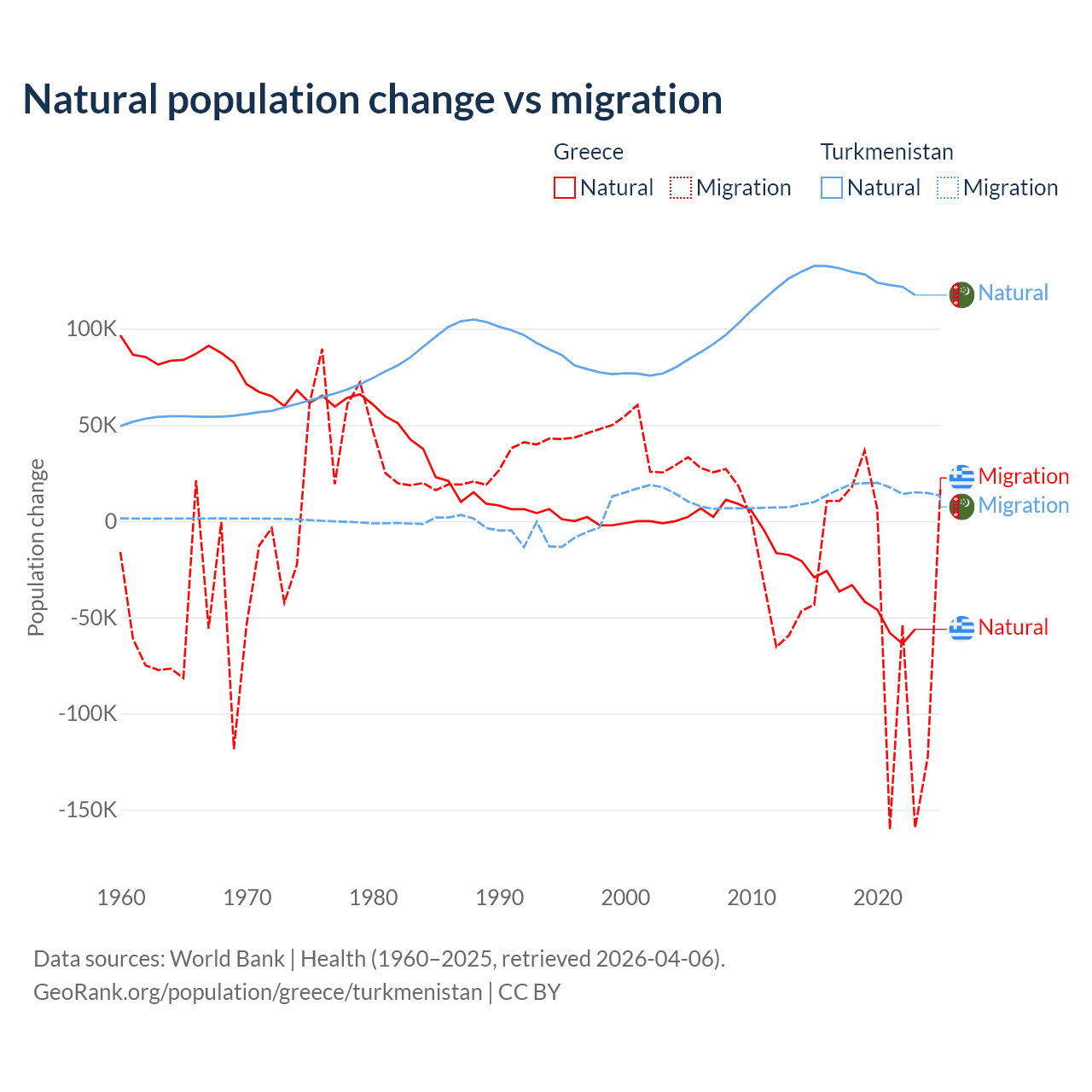 Over the last 10 years, 51.9% of the population change in Greece is from natural causes (a loss of 411,426 people) and 48.1% is from migration (a loss of 381,824 people). In Turkmenistan 89.2% is from natural causes (a gain of 1,270,228 people) and 10.8% is from migration (a gain of 154,379 people).