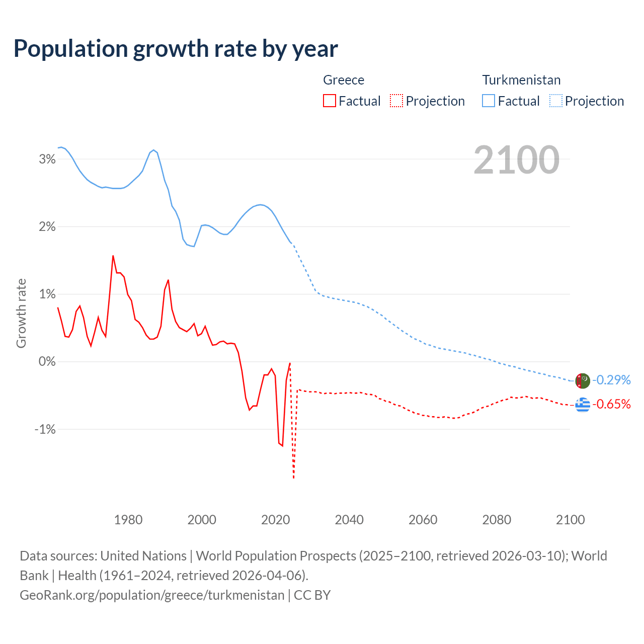 - For the last 10 years, Greece has had an average growth rate of -0.47% per year vs +2.14% in Turkmenistan.