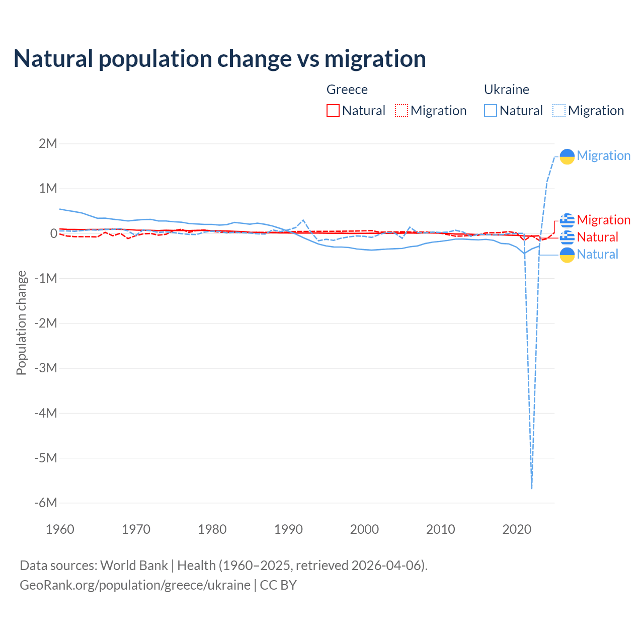 Over the last 10 years, 51.9% of the population change in Greece is from natural causes (a loss of 411,426 people) and 48.1% is from migration (a loss of 381,824 people). In Ukraine 28.2% is from natural causes (a loss of 2,435,153 people) and 71.8% is from migration (a loss of 6,198,995 people).