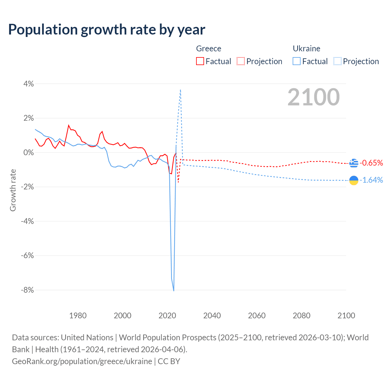 - For the last 10 years, Greece has had an average growth rate of -0.47% per year vs -1.74% in Ukraine.