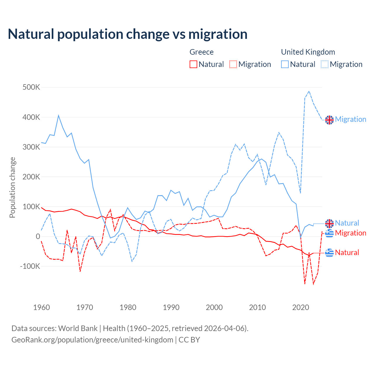 Over the last 10 years, 51.9% of the population change in Greece is from natural causes (a loss of 411,426 people) and 48.1% is from migration (a loss of 381,824 people). In the United Kingdom 23.9% is from natural causes (a gain of 1,033,129 people) and 76.1% is from migration (a gain of 3,283,101 people).