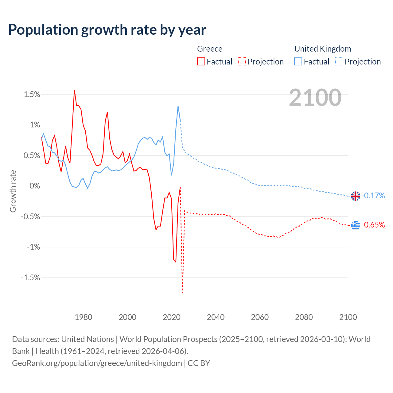 - For the last 10 years, Greece has had an average growth rate of -0.47% per year vs +0.7% in the United Kingdom.