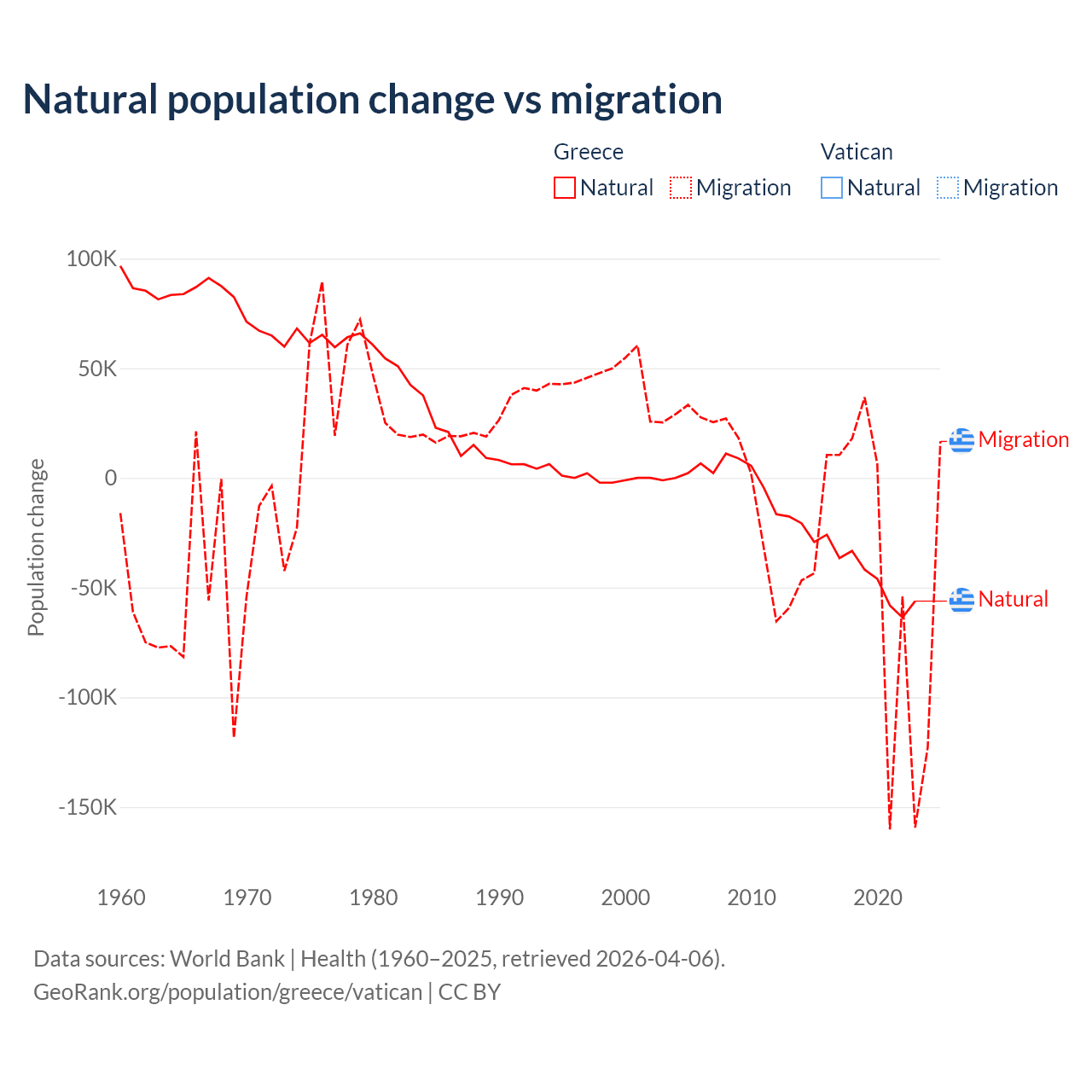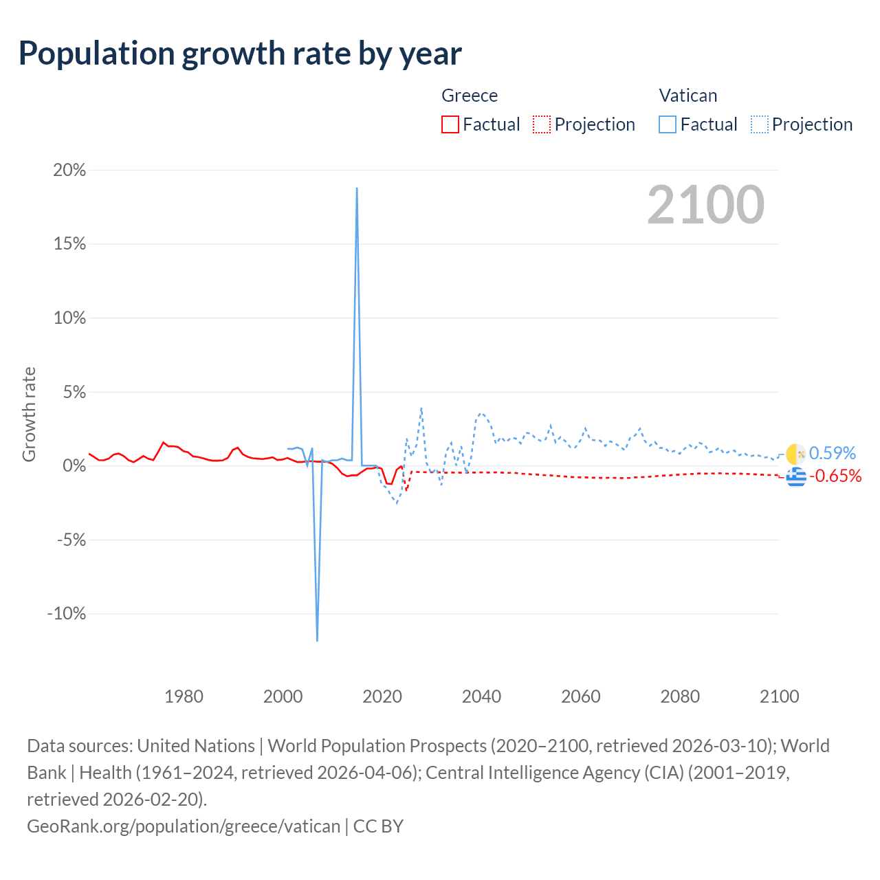 - For the last 10 years, Greece has had an average growth rate of -0.47% per year vs +1.9% in the Vatican.