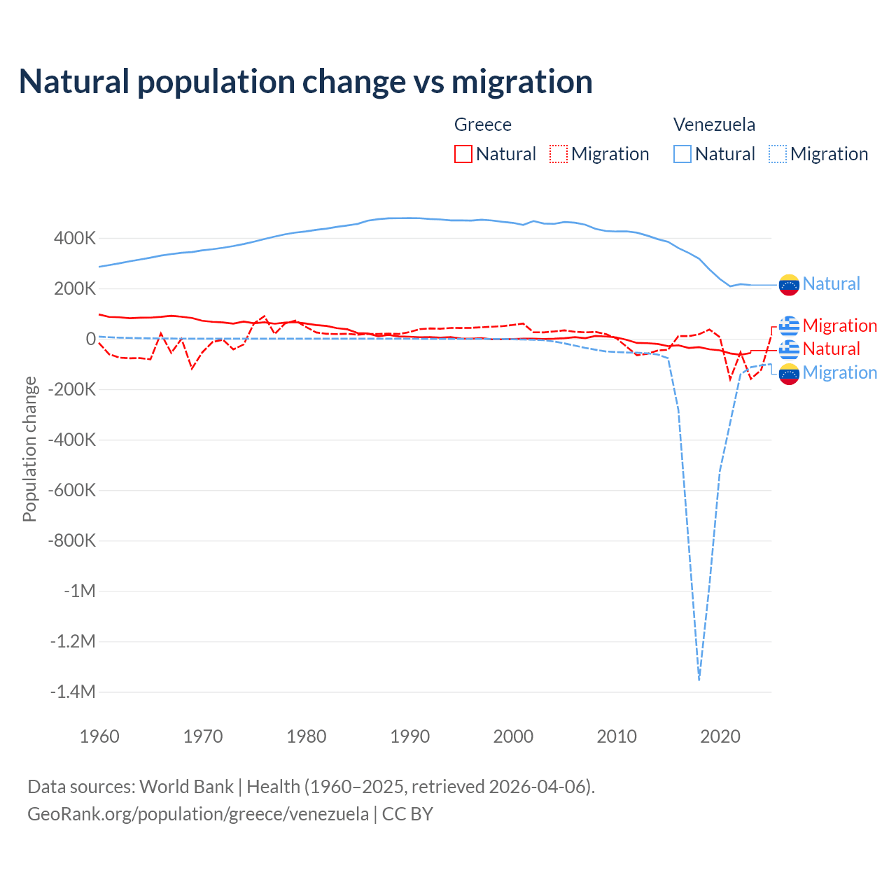 Over the last 10 years, 51.9% of the population change in Greece is from natural causes (a loss of 411,426 people) and 48.1% is from migration (a loss of 381,824 people). In Venezuela 38.6% is from natural causes (a gain of 2,946,257 people) and 61.4% is from migration (a loss of 4,683,227 people).