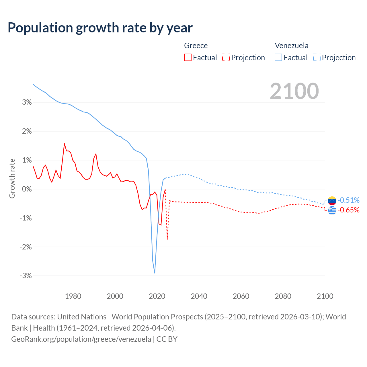 - For the last 10 years, Greece has had an average growth rate of -0.47% per year vs -0.46% in Venezuela.