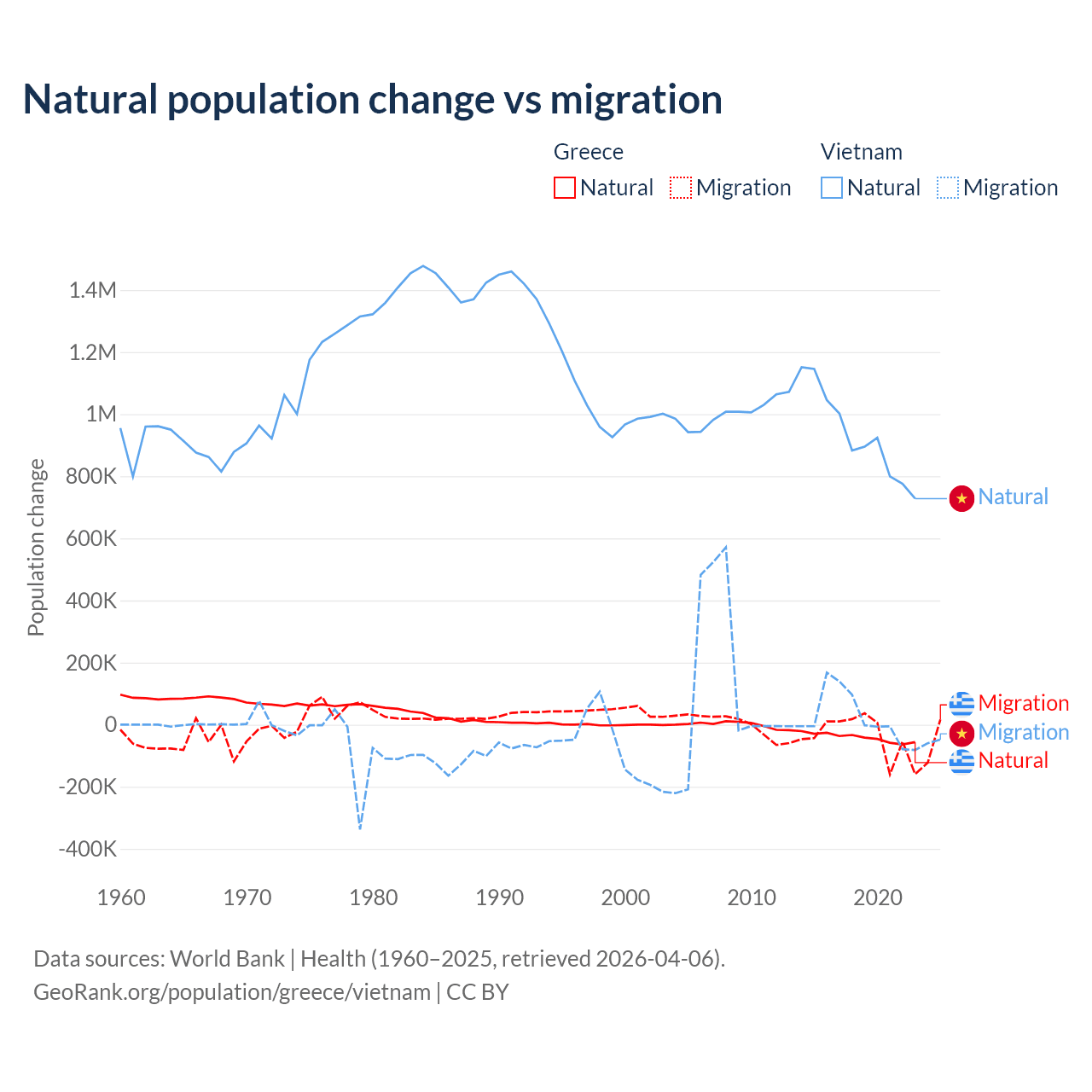 Over the last 10 years, 51.9% of the population change in Greece is from natural causes (a loss of 411,426 people) and 48.1% is from migration (a loss of 381,824 people). In Vietnam 97.7% is from natural causes (a gain of 9,349,756 people) and 2.29% is from migration (a gain of 219,073 people).