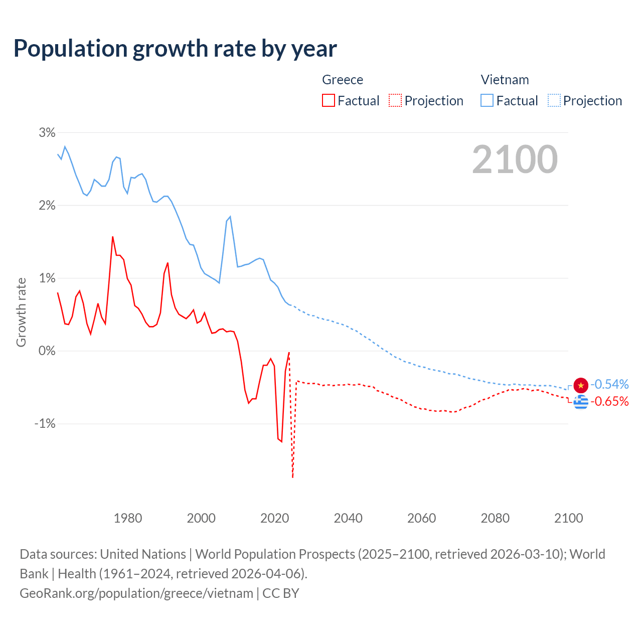 Data sources: World Bank | Health (1960–2024, retrieved 2026-04-06); United Nations | World Population Prospects (1960–2026, retrieved 2026-03-10); U.S. Census Bureau (1960–2025, retrieved 2026-02-08); Central Intelligence Agency (CIA) (2000–2019, retrieved 2026-02-20).