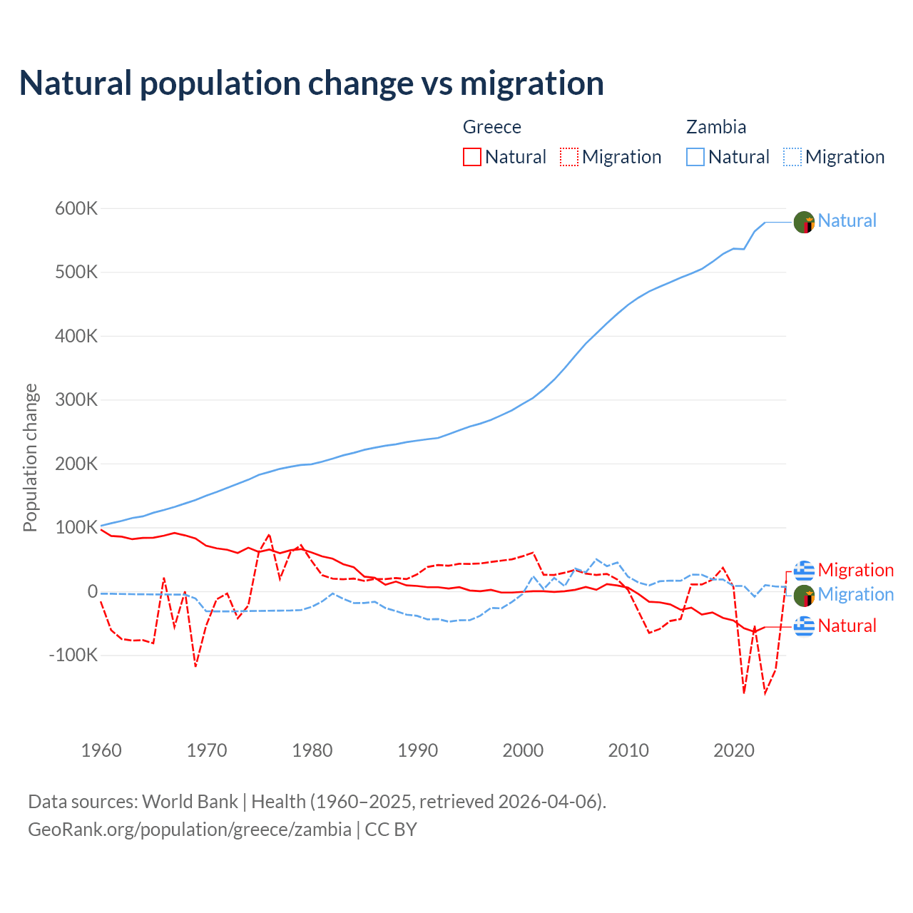 Over the last 10 years, 51.9% of the population change in Greece is from natural causes (a loss of 411,426 people) and 48.1% is from migration (a loss of 381,824 people). In Zambia 97.4% is from natural causes (a gain of 5,233,797 people) and 2.58% is from migration (a gain of 138,554 people).