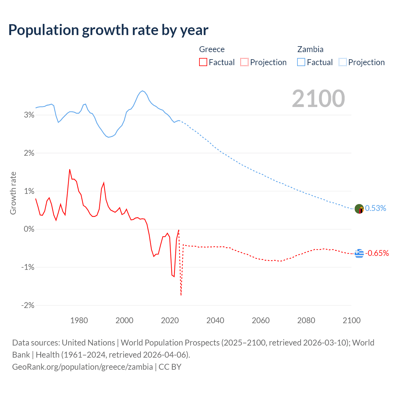 - For the last 10 years, Greece has had an average growth rate of -0.47% per year vs +3% in Zambia.