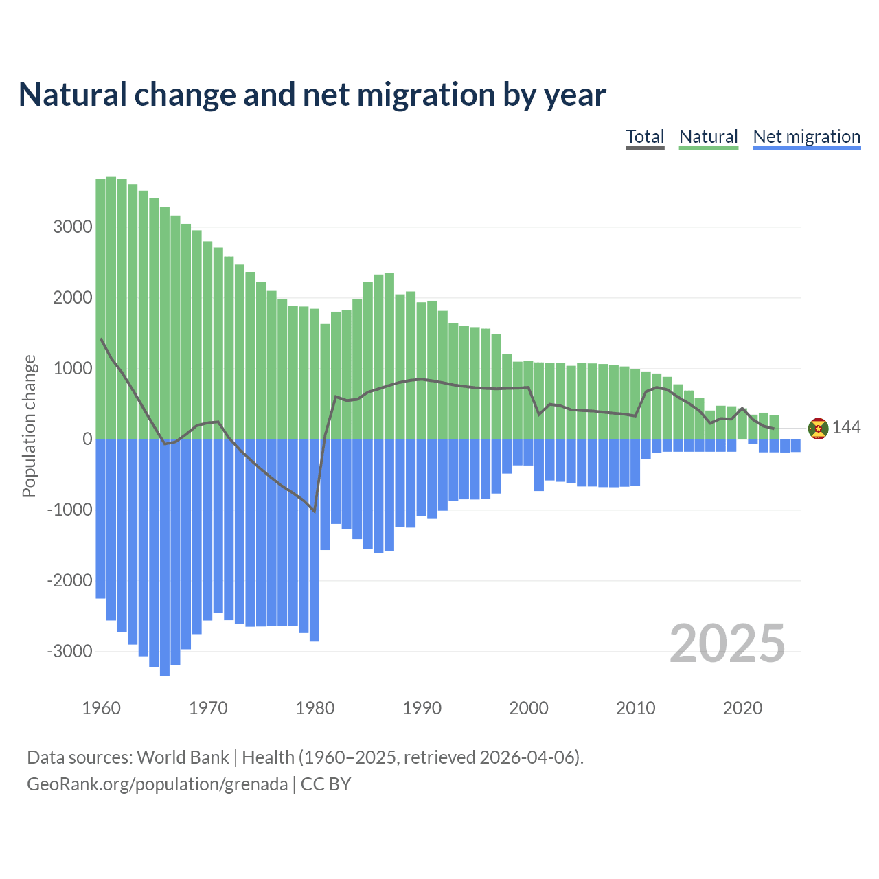 Over the last 10 years, 76% of the population change in Grenada is from natural causes (a gain of 4,850 people) and 24% is from migration (a loss of 1,535 people).