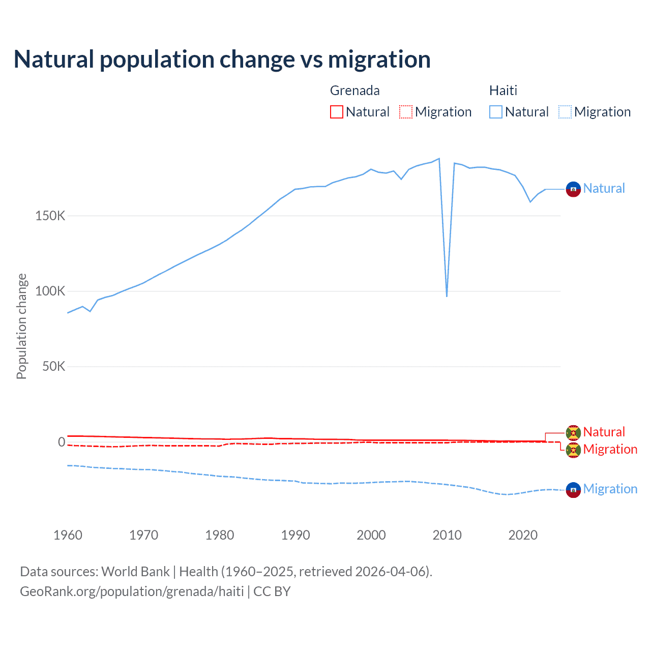 Over the last 10 years, 76% of the population change in Grenada is from natural causes (a gain of 4,850 people) and 24% is from migration (a loss of 1,535 people). In Haiti 83.9% is from natural causes (a gain of 1,740,319 people) and 16.1% is from migration (a loss of 333,076 people).