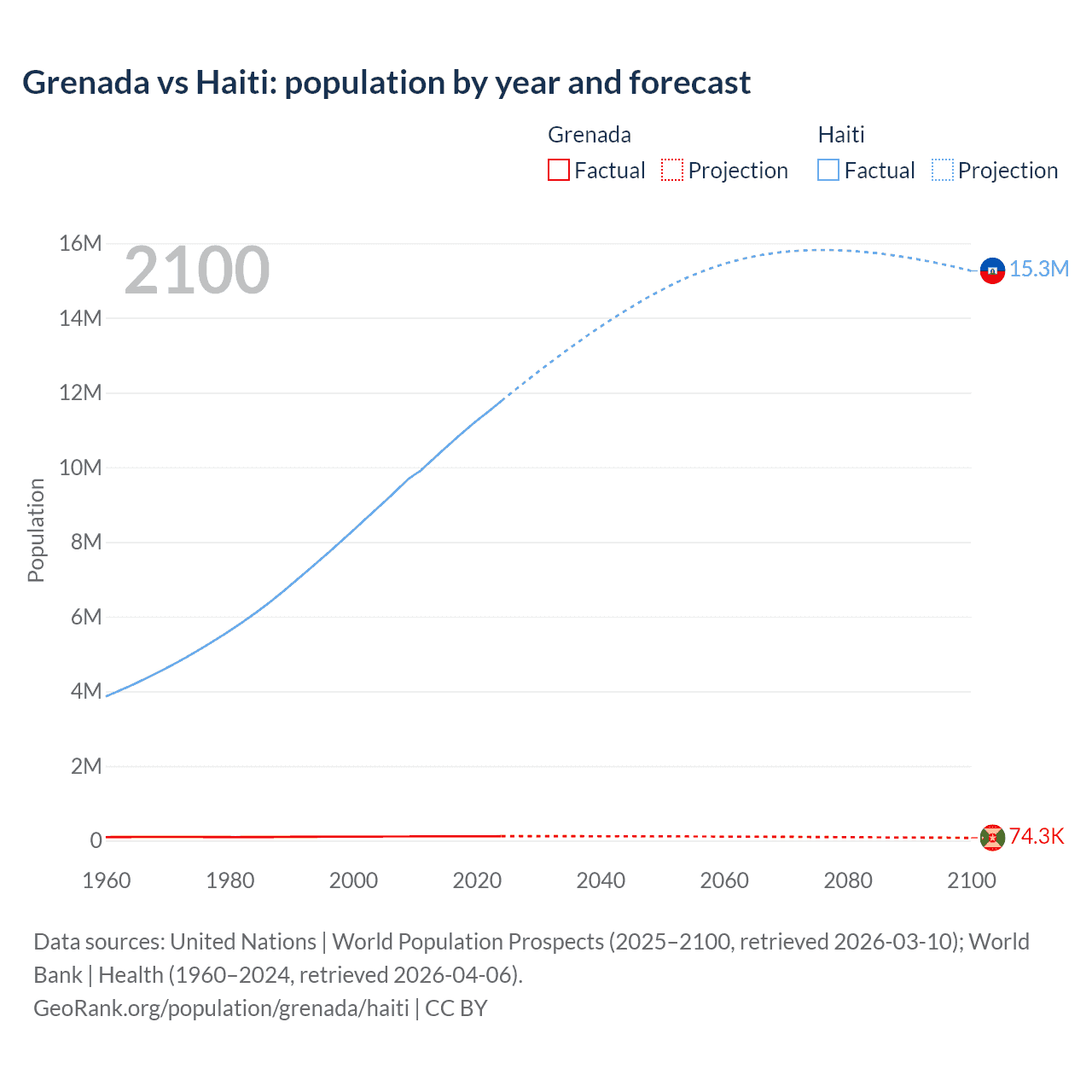 Grenada vs Haiti: population by year and forecast