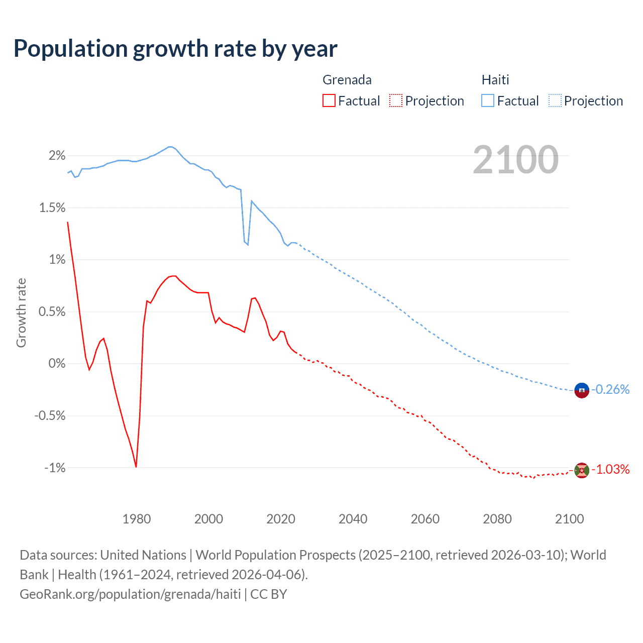 - For the last 10 years, Grenada has had an average growth rate of +0.29% per year vs +1.29% in Haiti.