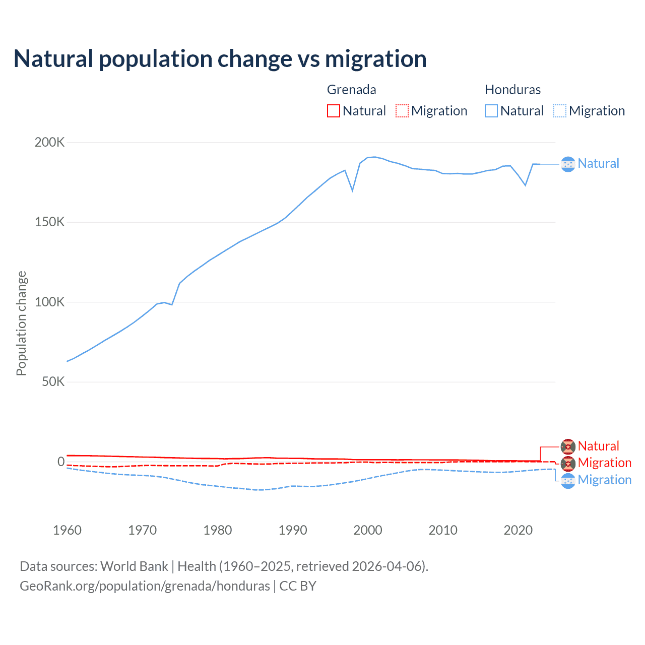 Over the last 10 years, 76% of the population change in Grenada is from natural causes (a gain of 4,850 people) and 24% is from migration (a loss of 1,535 people). In Honduras 96.7% is from natural causes (a gain of 1,821,125 people) and 3.29% is from migration (a loss of 61,965 people).