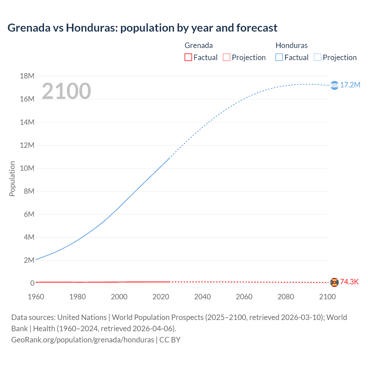 Grenada vs Honduras: population by year and forecast