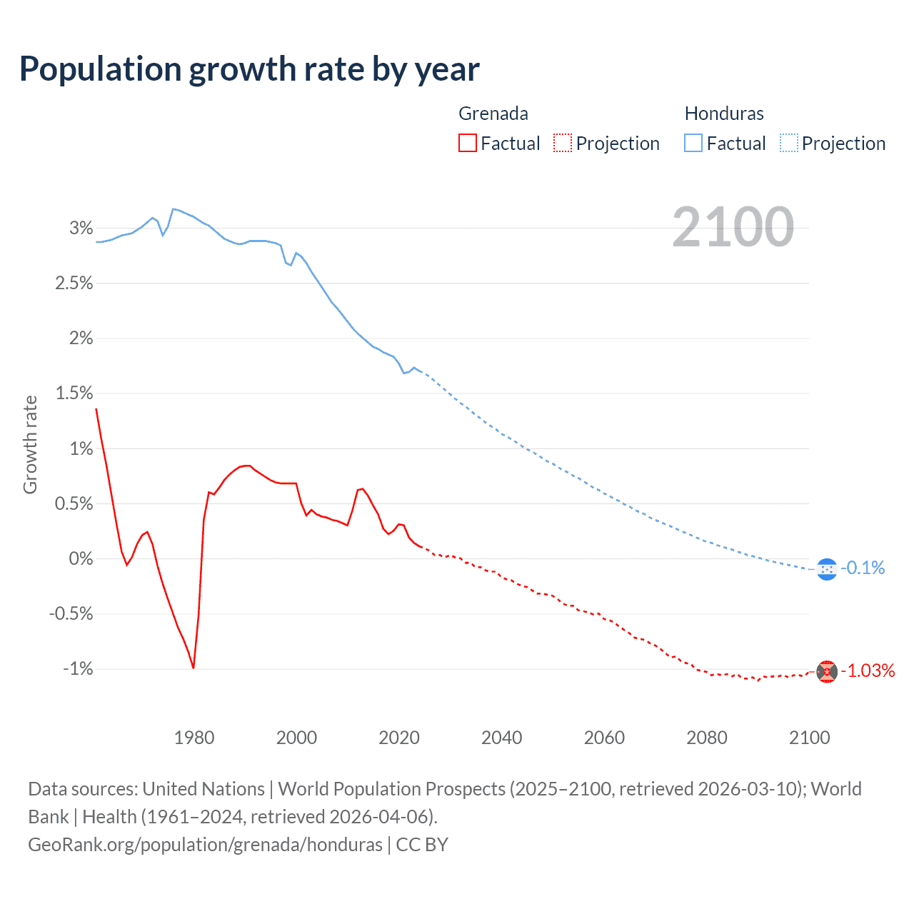 - For the last 10 years, Grenada has had an average growth rate of +0.29% per year vs +1.81% in Honduras.