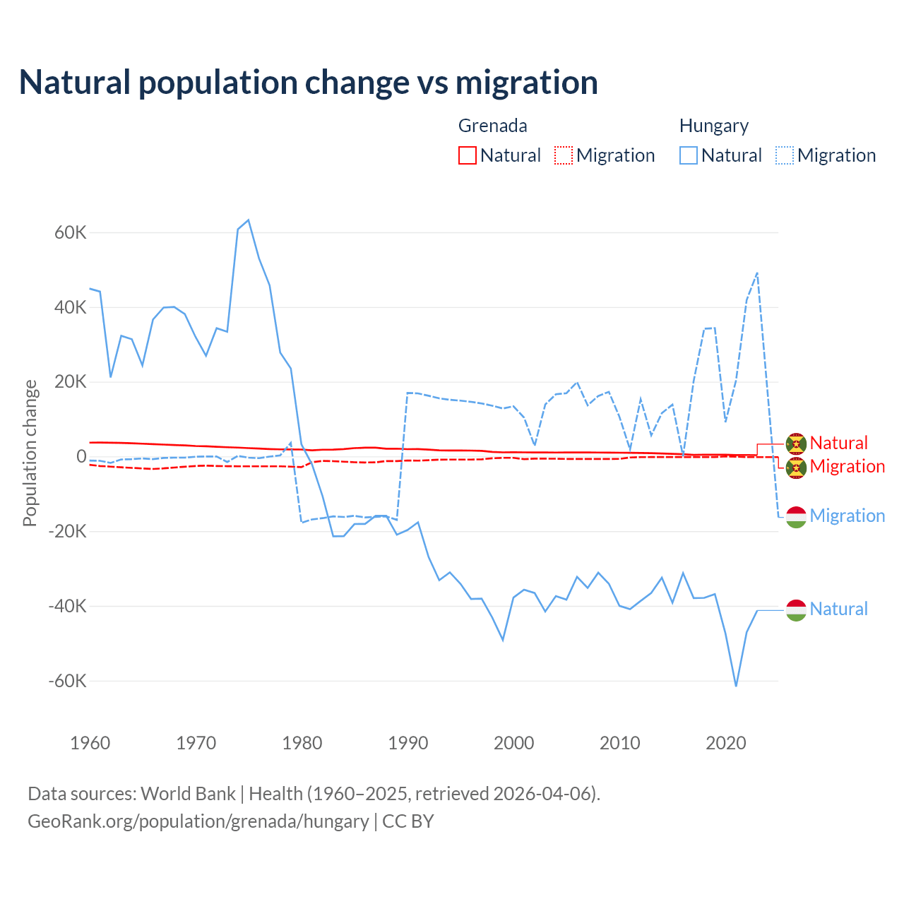 Over the last 10 years, 76% of the population change in Grenada is from natural causes (a gain of 4,850 people) and 24% is from migration (a loss of 1,535 people). In Hungary 63.7% is from natural causes (a loss of 412,838 people) and 36.3% is from migration (a gain of 234,837 people).