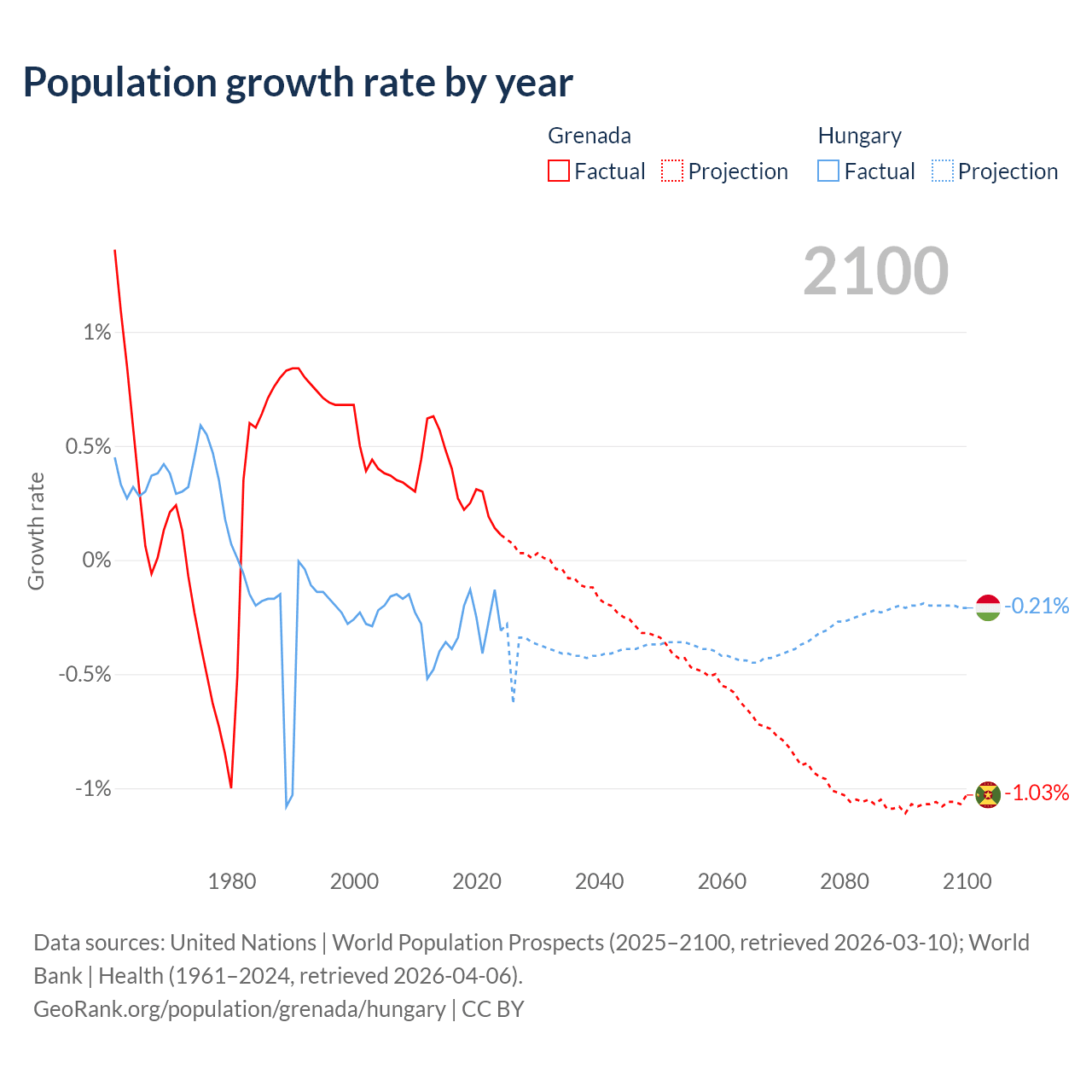- For the last 10 years, Grenada has had an average growth rate of +0.29% per year vs -0.29% in Hungary.