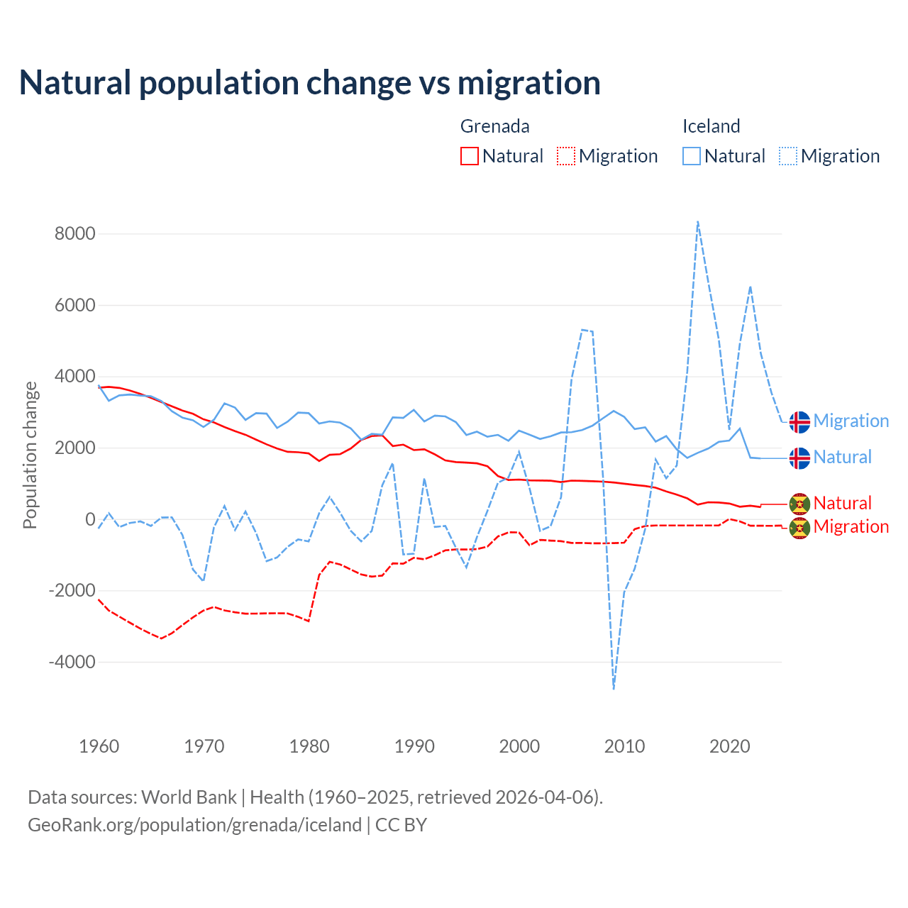 Over the last 10 years, 76% of the population change in Grenada is from natural causes (a gain of 4,850 people) and 24% is from migration (a loss of 1,535 people). In Iceland 30.7% is from natural causes (a gain of 20,128 people) and 69.3% is from migration (a gain of 45,356 people).