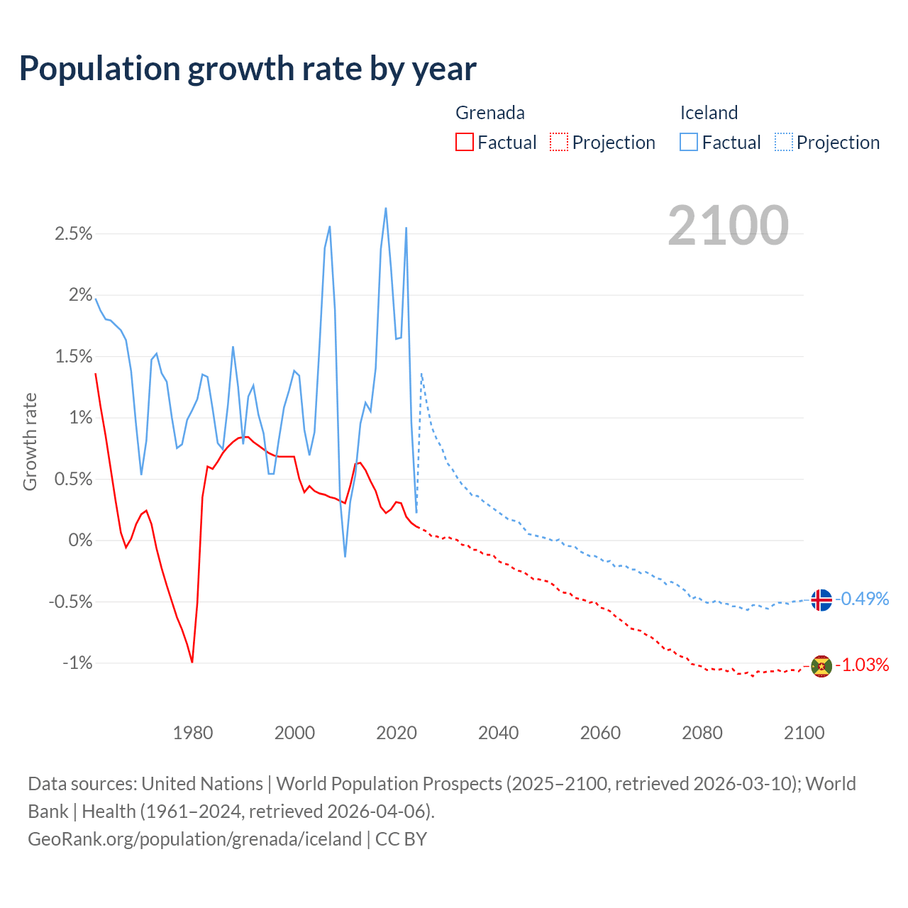 - For the last 10 years, Grenada has had an average growth rate of +0.29% per year vs +1.63% in Iceland.