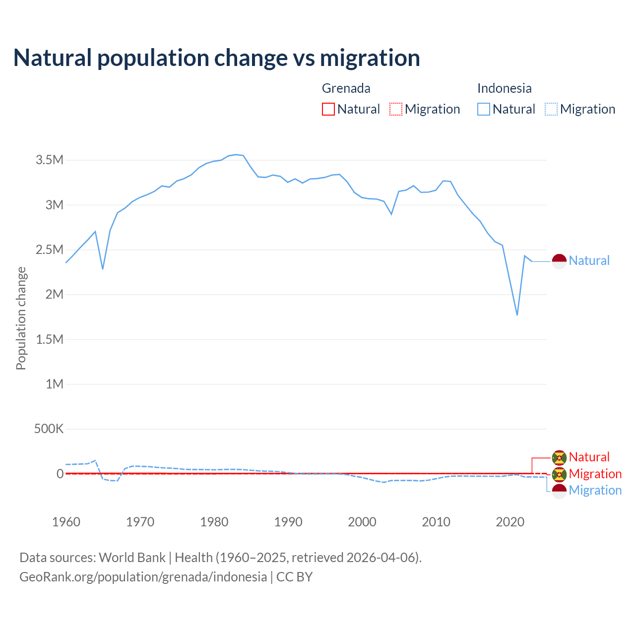 Over the last 10 years, 76% of the population change in Grenada is from natural causes (a gain of 4,850 people) and 24% is from migration (a loss of 1,535 people). In Indonesia 98.9% is from natural causes (a gain of 25,242,860 people) and 1.1% is from migration (a loss of 280,258 people).