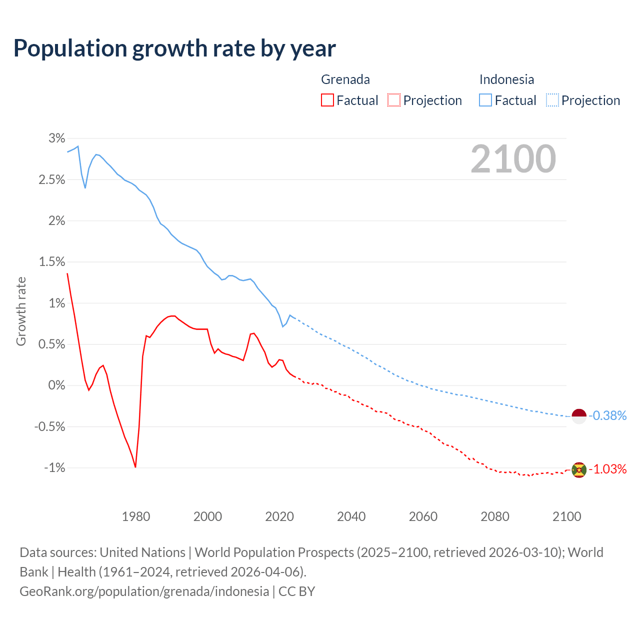 - For the last 10 years, Grenada has had an average growth rate of +0.29% per year vs +0.94% in Indonesia.