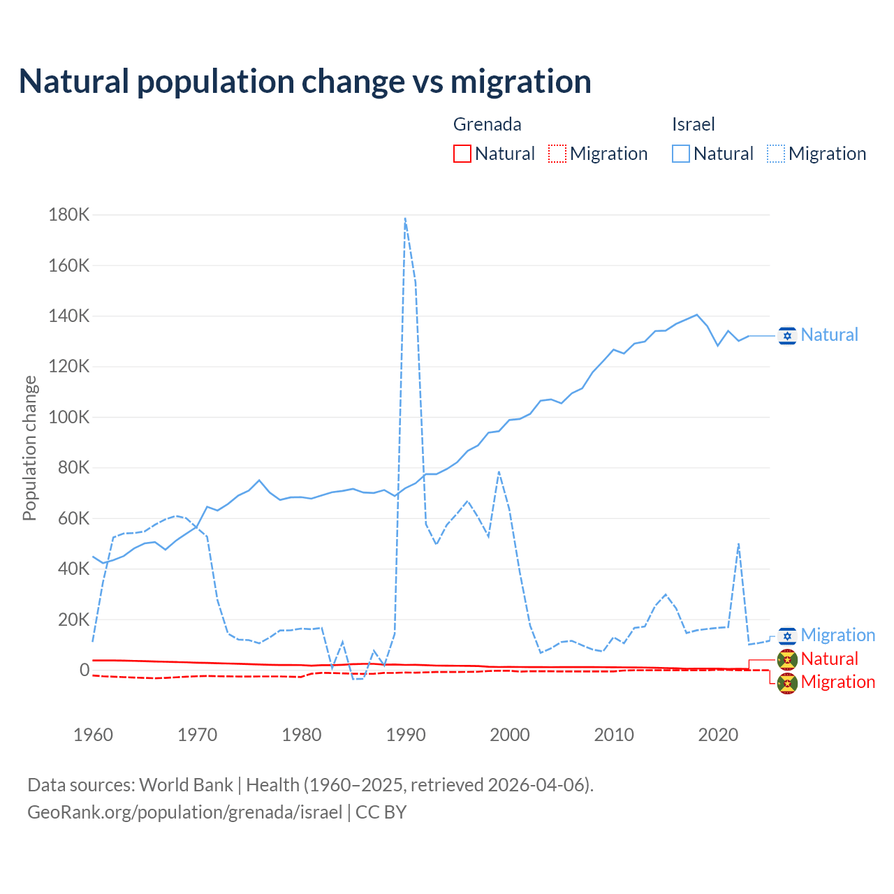 Over the last 10 years, 76% of the population change in Grenada is from natural causes (a gain of 4,850 people) and 24% is from migration (a loss of 1,535 people). In Israel 86% is from natural causes (a gain of 1,343,492 people) and 14% is from migration (a gain of 219,048 people).