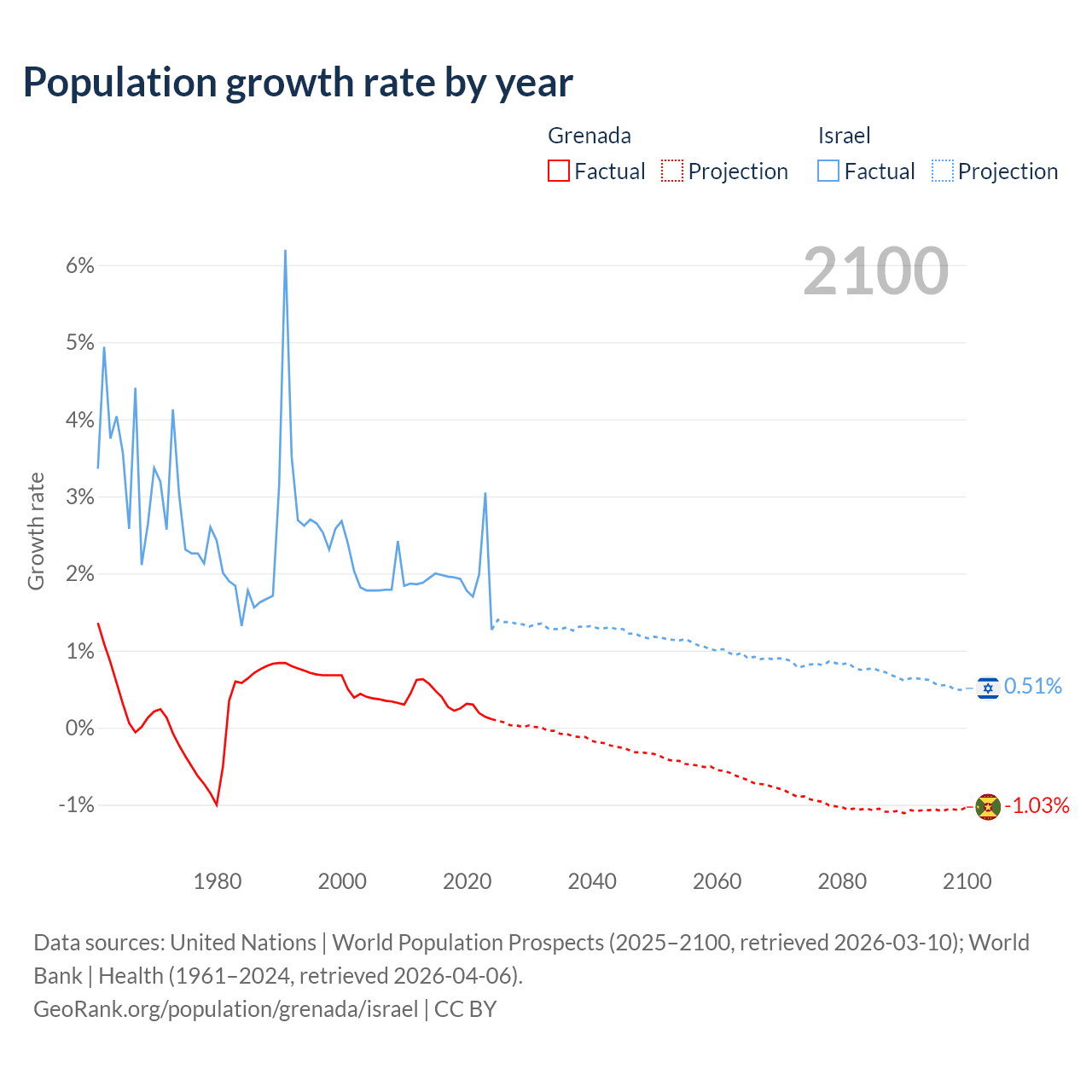 - For the last 10 years, Grenada has had an average growth rate of +0.29% per year vs +1.96% in Israel.