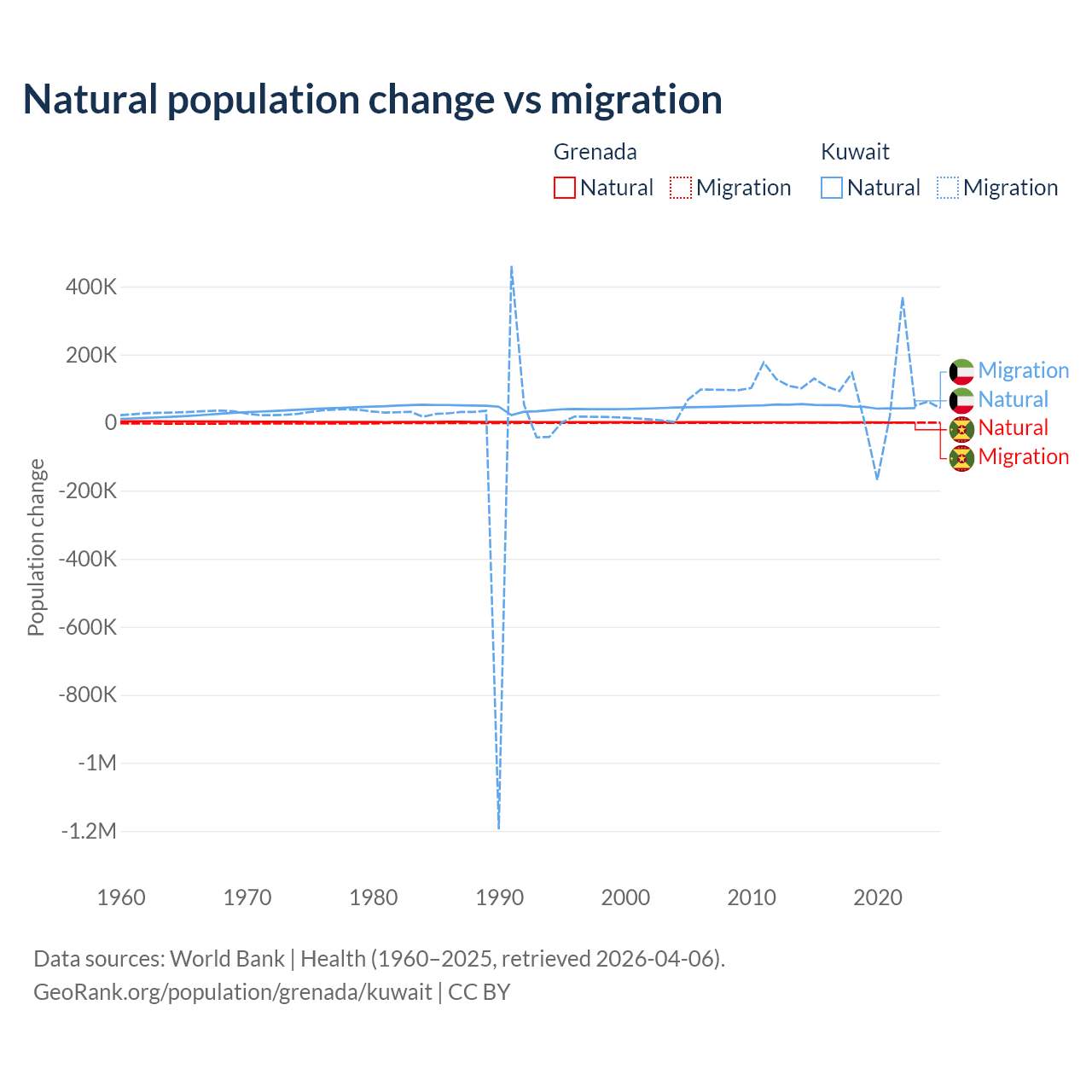 Over the last 10 years, 76% of the population change in Grenada is from natural causes (a gain of 4,850 people) and 24% is from migration (a loss of 1,535 people). In Kuwait 35.8% is from natural causes (a gain of 470,645 people) and 64.2% is from migration (a gain of 845,142 people).