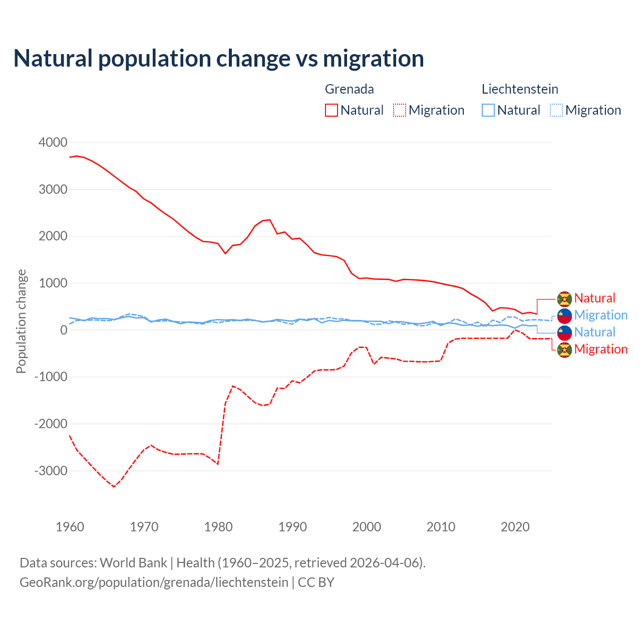 Over the last 10 years, 76% of the population change in Grenada is from natural causes (a gain of 4,850 people) and 24% is from migration (a loss of 1,535 people). In Liechtenstein 32.4% is from natural causes (a gain of 883 people) and 67.6% is from migration (a gain of 1,843 people).