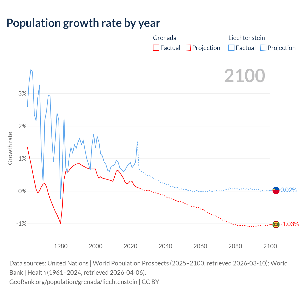 - For the last 10 years, Grenada has had an average growth rate of +0.29% per year vs +0.82% in Liechtenstein.