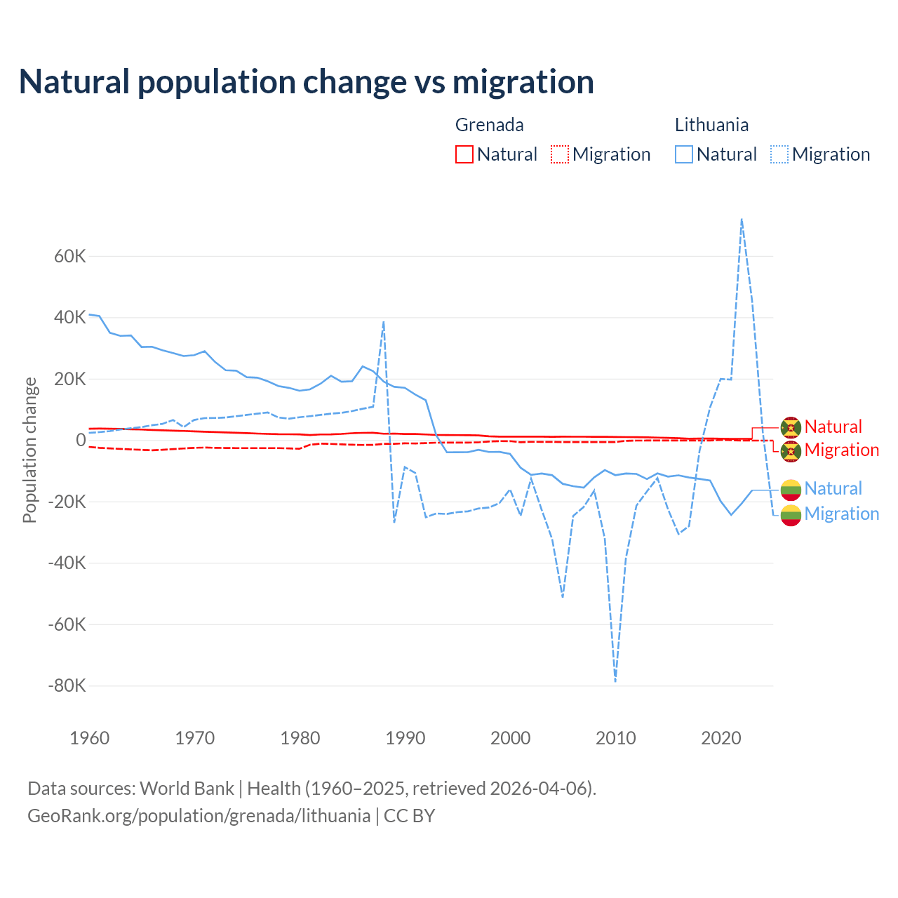 Over the last 10 years, 76% of the population change in Grenada is from natural causes (a gain of 4,850 people) and 24% is from migration (a loss of 1,535 people). In Lithuania 68.7% is from natural causes (a loss of 153,859 people) and 31.3% is from migration (a gain of 70,196 people).